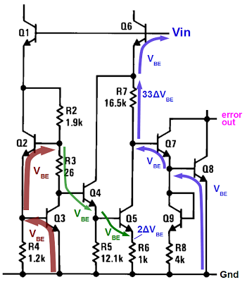 下图展示了7805的带隙电路,箭头显示电压变化(非电流)。从地面开始,红色箭头显示Q3上(较大的)VBE增加,Q2上又增加了一个(较大的)VBE。绿色箭头显示第四季度和第五季度(V_4)的(小幅)VBE下降。结果是差值2ΔVBE在R6上得到。