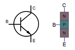 一个NPN晶体管及其过于简化的结构。