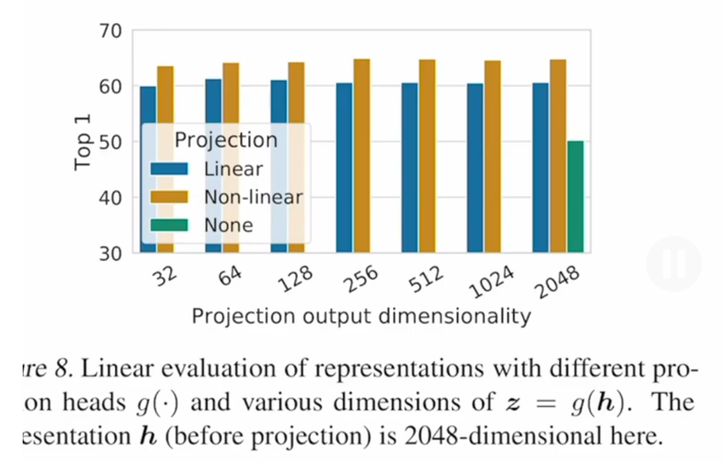下图说明,1- 增加非线性层比直接用编码器增加很大;2- 非线性层比线性层增加10个点;3- 维度128就已经很好,无需更大;