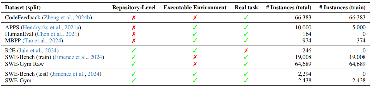 Table 1: SWE-Gym is the first publicly available training environment combining real-world SWE tasks from GitHub issues with pre-installed dependencies and executable test verification. Repository-level: whether each task is situated in a sophisticated repository; Executable Environment: whether each task instance comes with an executable environment with all relevant dependencies pre-installed; Real task: whether task instruction is collected from human developers.