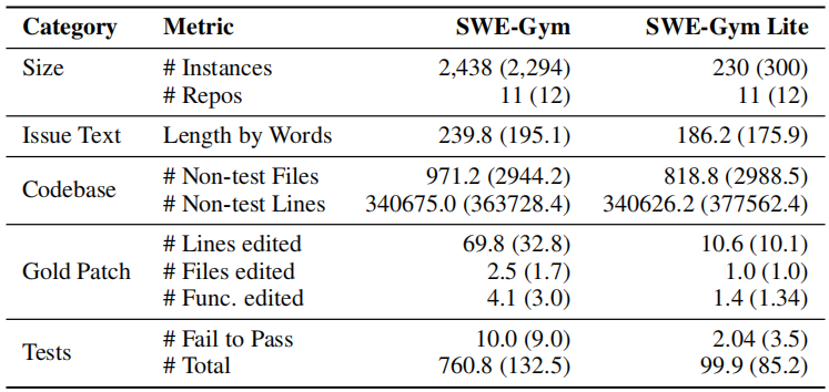 Table 2: Statistics comparing SWE-Gym with the SWE-Bench test split (in parenthesis).