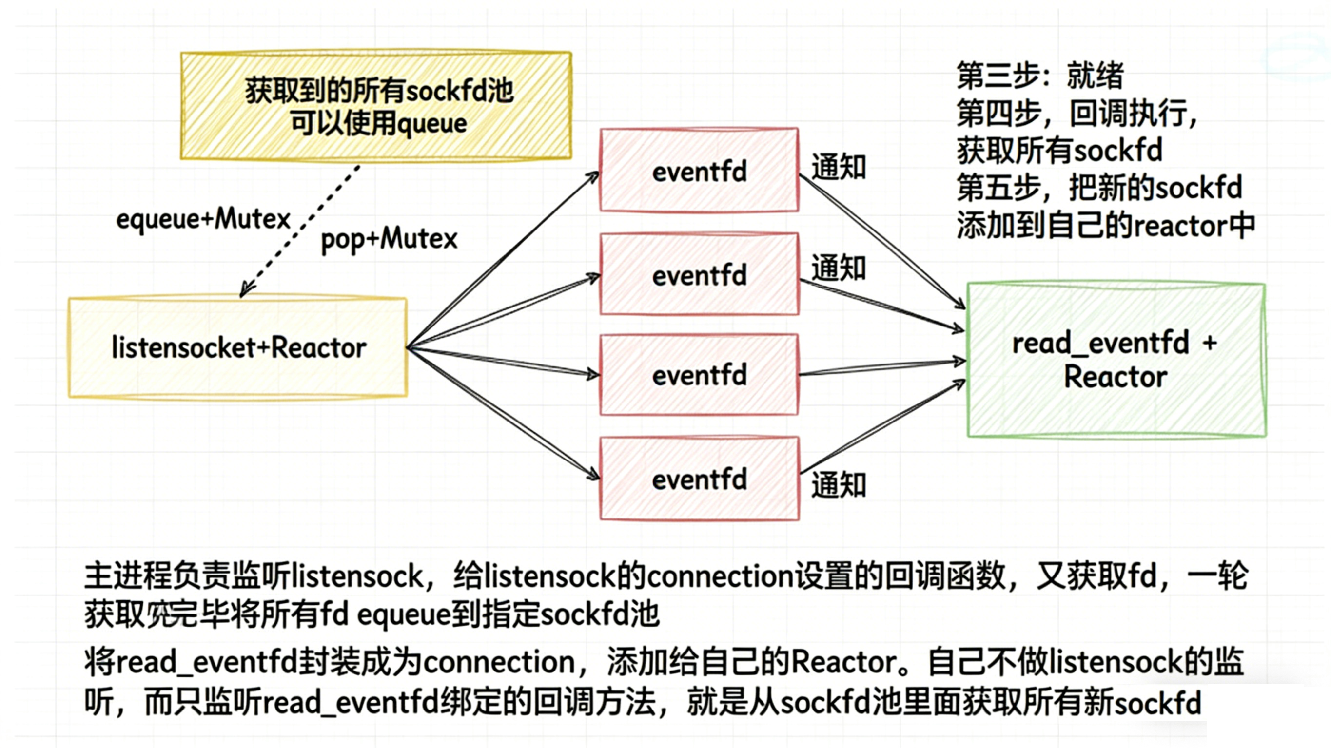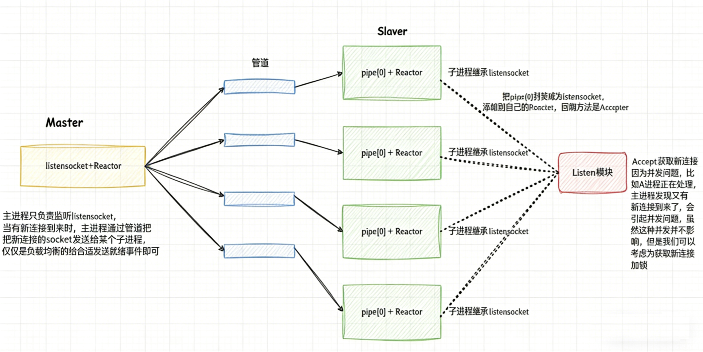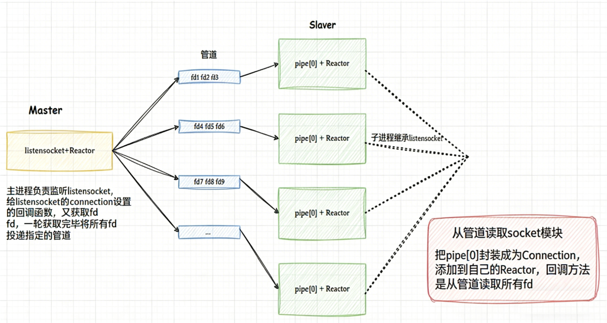 • 多线程是可以共享文件fd的,如果我们把⼯作职责变一下(其实就是修改一下connection的回调方法),让master线程,检测并且直接accepter到新的连接fd列表,然后通过管道传递给每一个⼦进程,每个⼦进程拿到sockfd,直接添加到自己的Reactor中,进行IO处理就可以,这样做会更简单。
