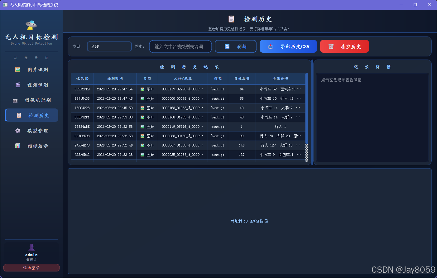 | 图片识别 | 支持 JPG/PNG/BMP 等格式,上传图片后点击开始检测,支持拖拽导入,可导出检测结果图片与 CSV |