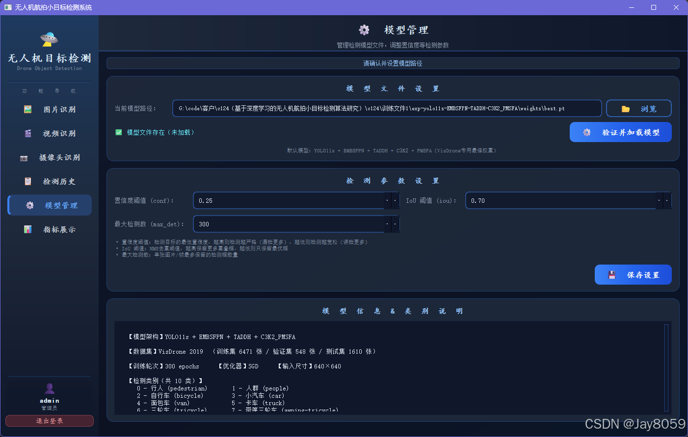 | 模型管理 | 管理检测模型文件路径,调整置信度、IoU 阈值等检测参数,验证模型加载 |