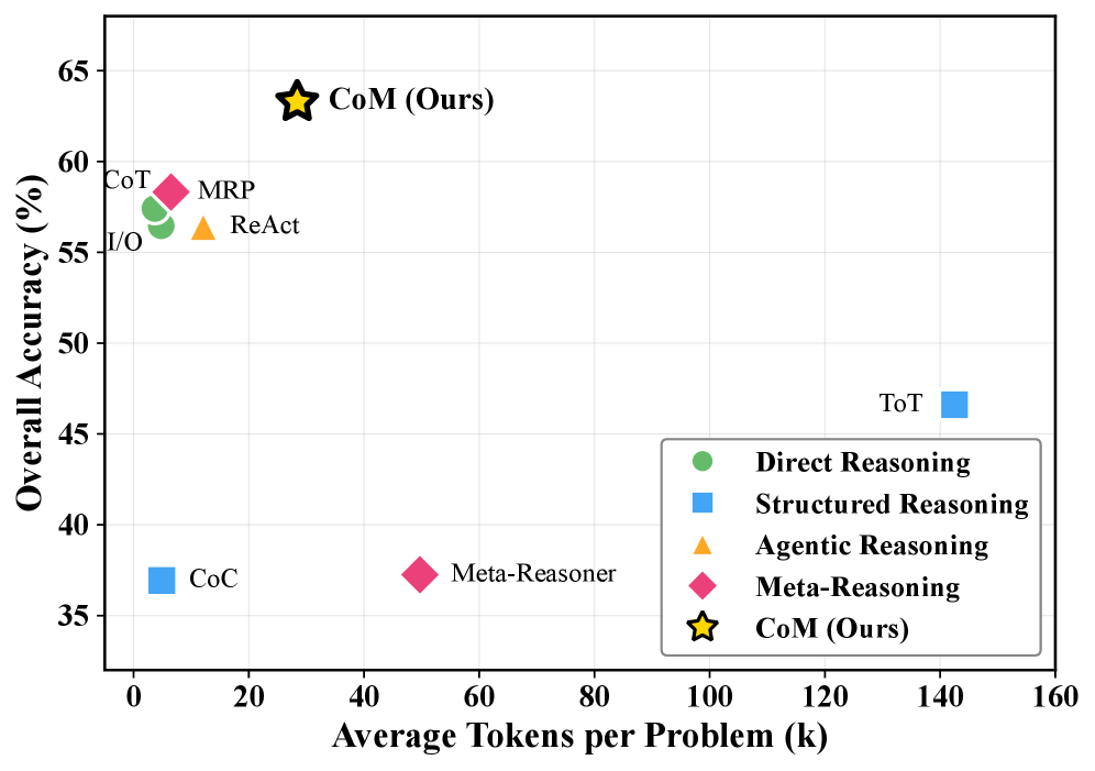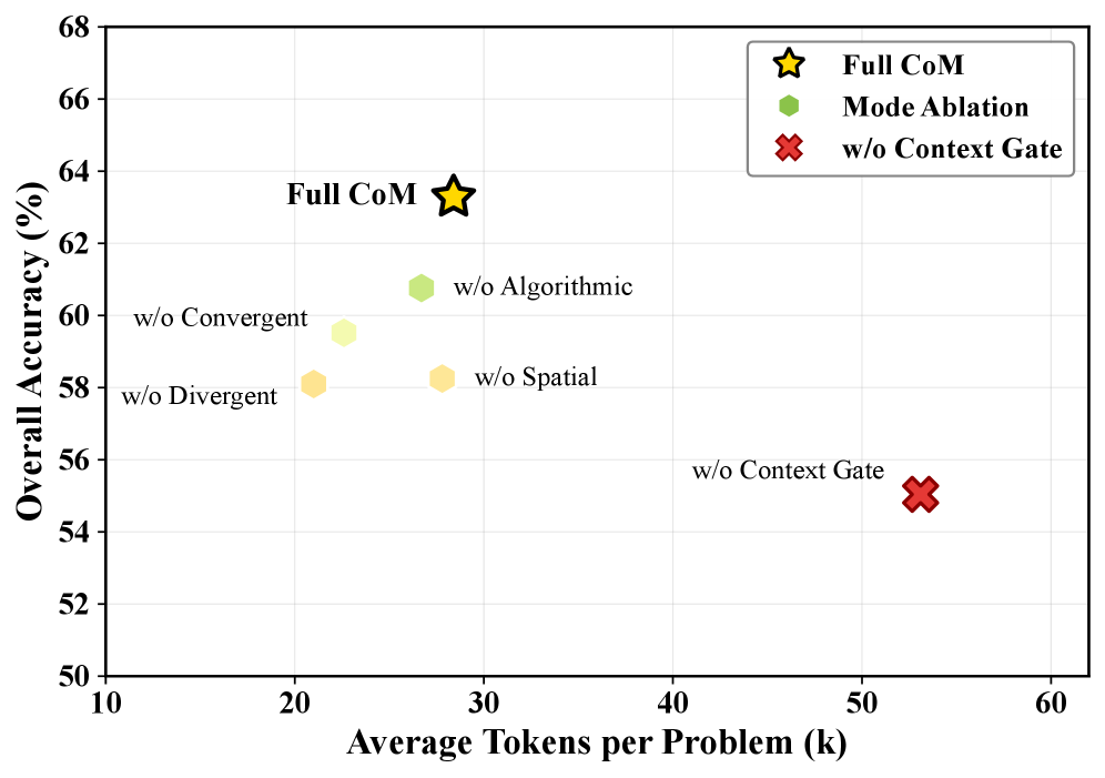 图1:CoM的三层解耦架构。Meta-Agent作为中央控制器,管理四种思维专家模块,双向Context Gate控制信息流。