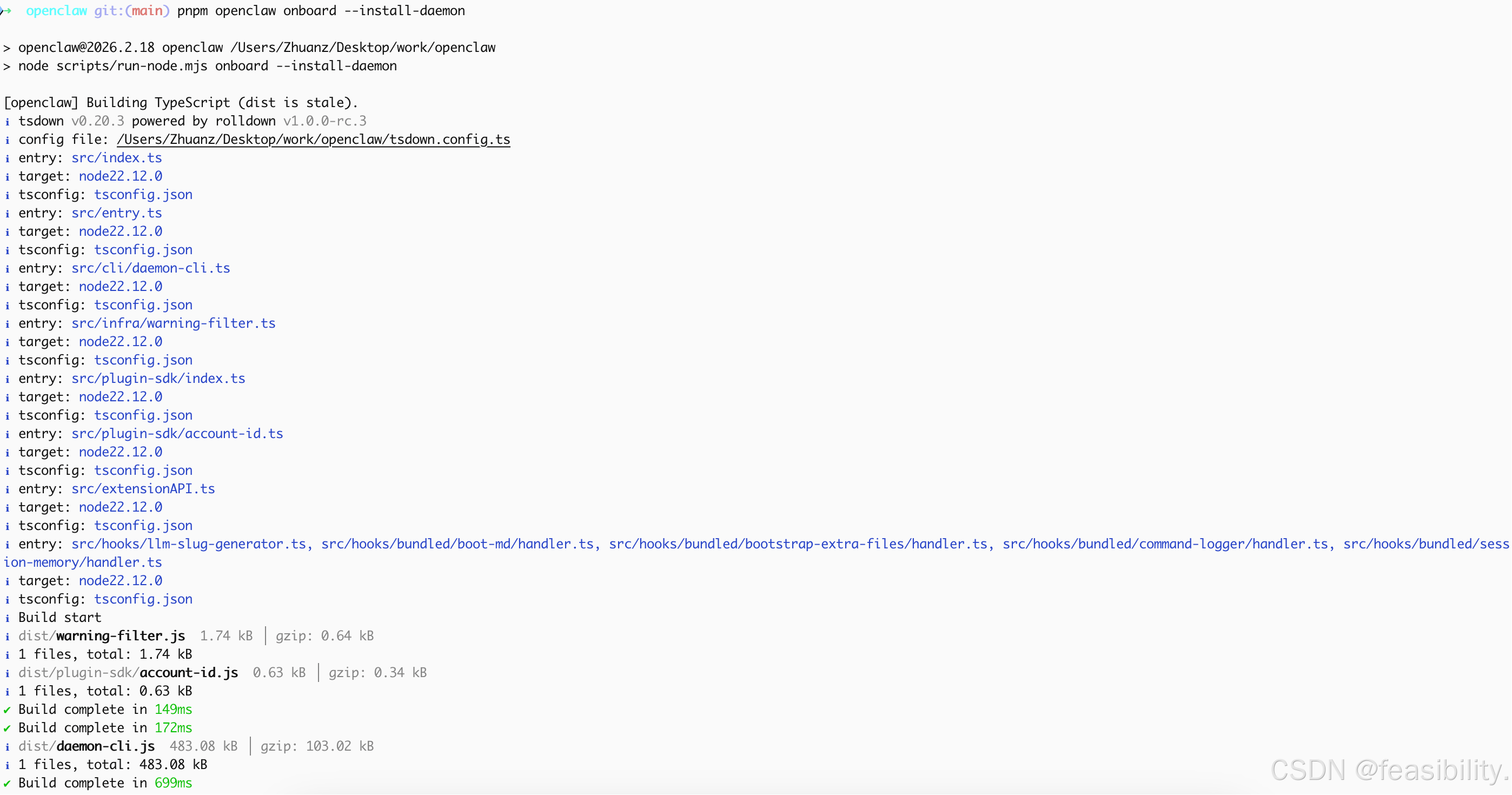 执行pnpm openclaw onboard --install-daemon运行配置向导(安装守护进程),完成初始化