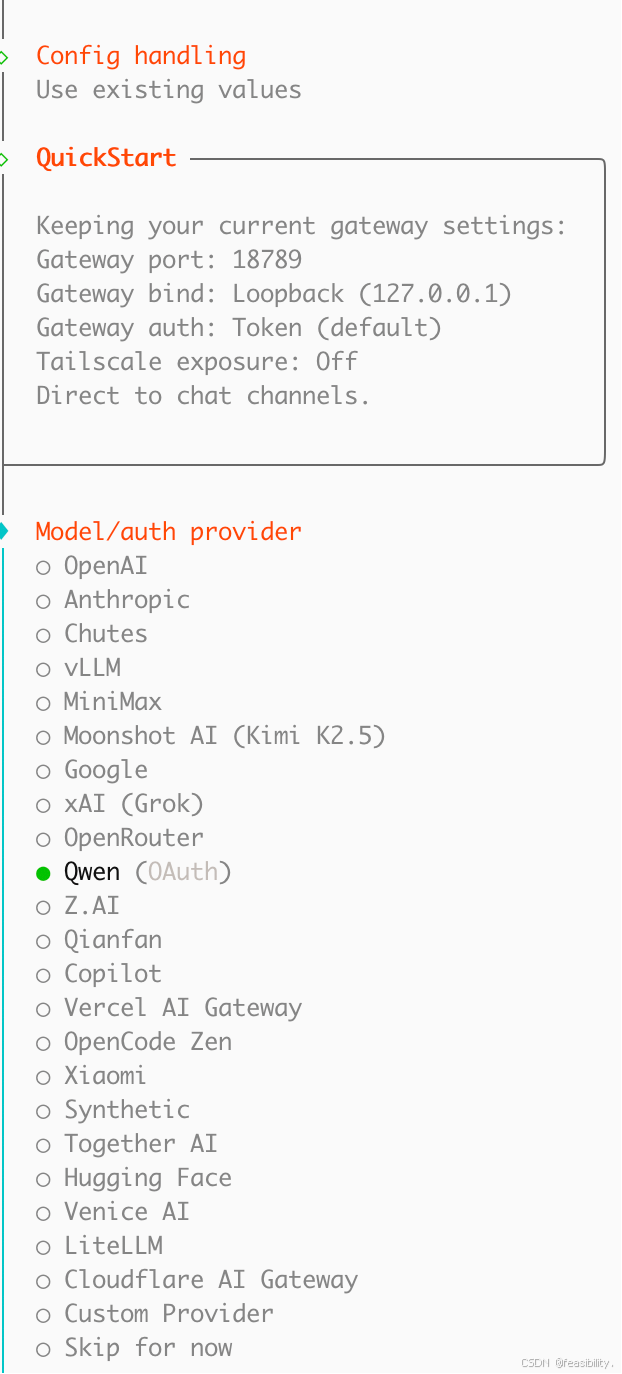 任选一个模型提供商都行,没有对应的提供商的密钥可以跳过,如果是本地模型选vLLM(需用vLLM框架启动模型,有性能优势,但原生vLLM仅完全支持Linux的cuda)、Custom Provider(**可以连接任何 OpenAI 或 Anthropic 兼容的端点,包括托管提供商和自托管端点)**和 LiteLLM (最通用,能通过中间层转换支持任意后端,既支持云端也支持本地模型,也包括Ollama、vLLM、LM Studio、llama.cpp 等本地后端)