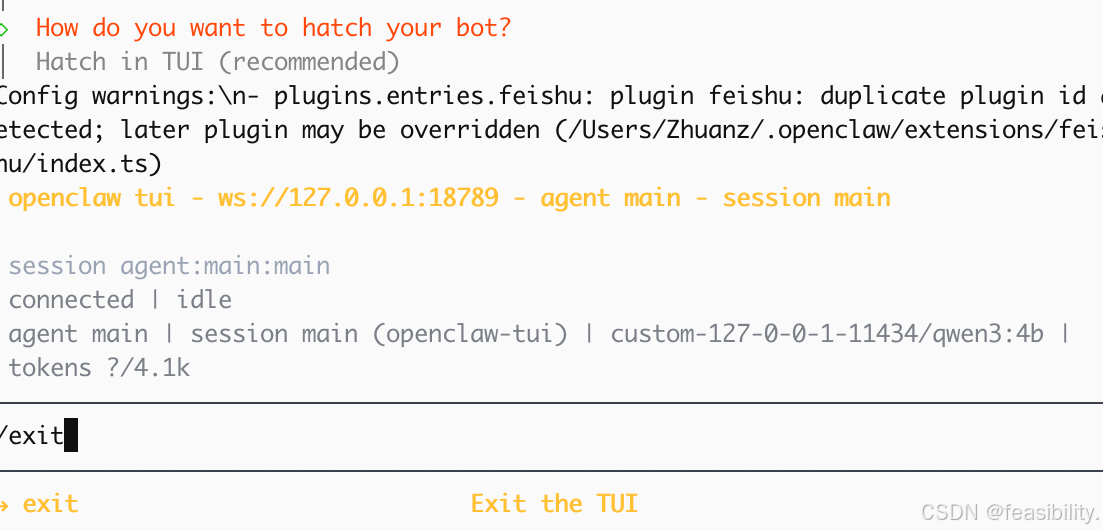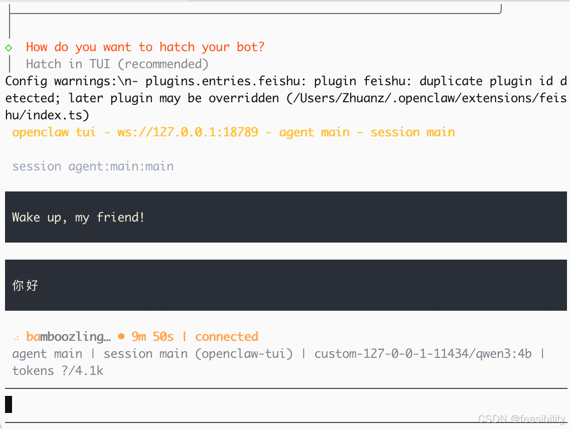 终端执行pnpm openclaw tui,输入问题,成功回答