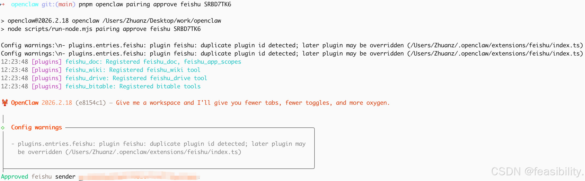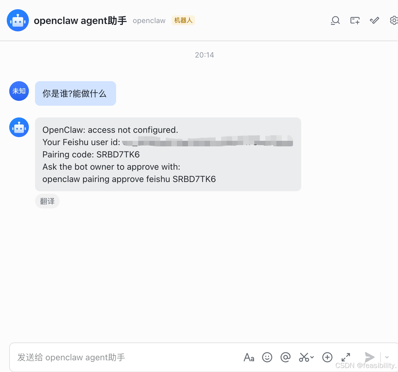 打开测试,如果出现以下情况,到openclaw项目的终端执行pnpm openclaw pairing approve feishu 对应的配对码