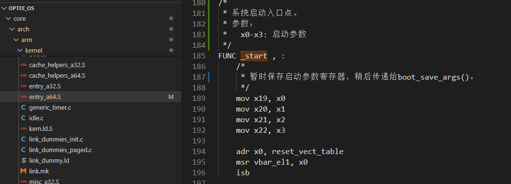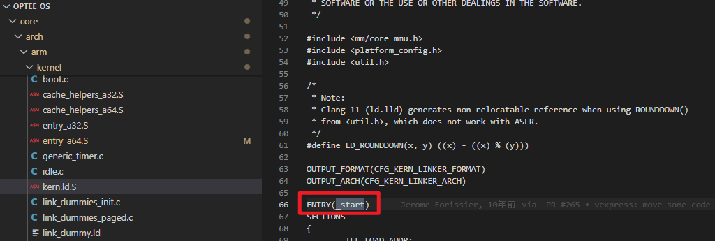 通过链接脚本kern.ld.S 定义了 _start 为OPTEE-OS的启动入口