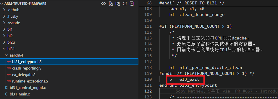 - 执行 el3_exit() 汇编函数,触发 ERET(Exception Return)指令