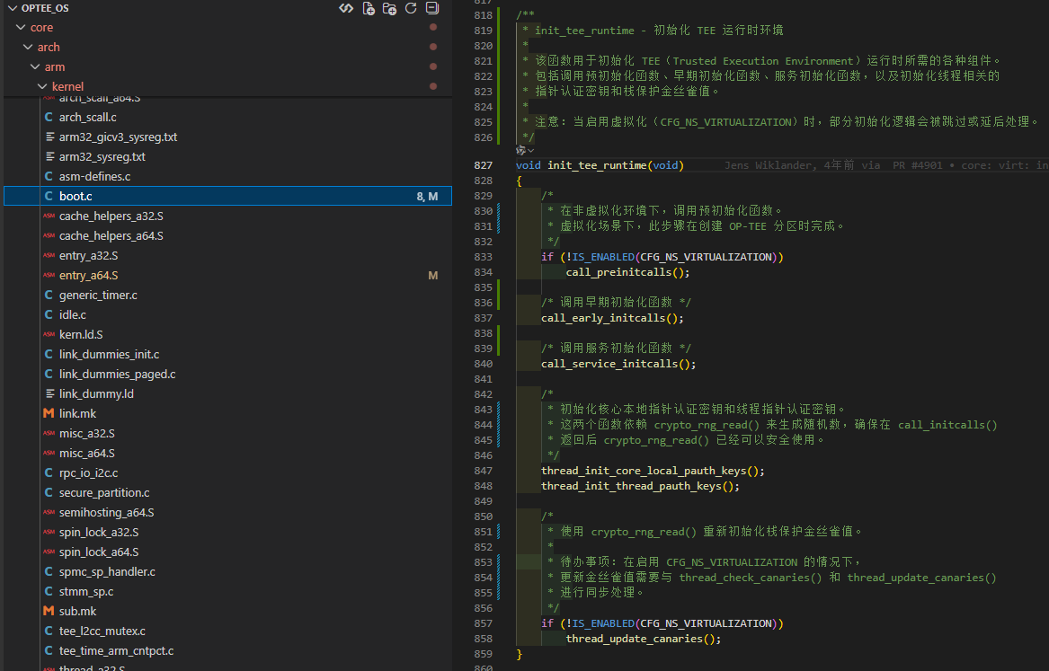 - core/arch/:架构相关代码(ARMv7-A/ARMv8-A/ARMv9-A),包含汇编入口、上下文切换、MMU/页表管理