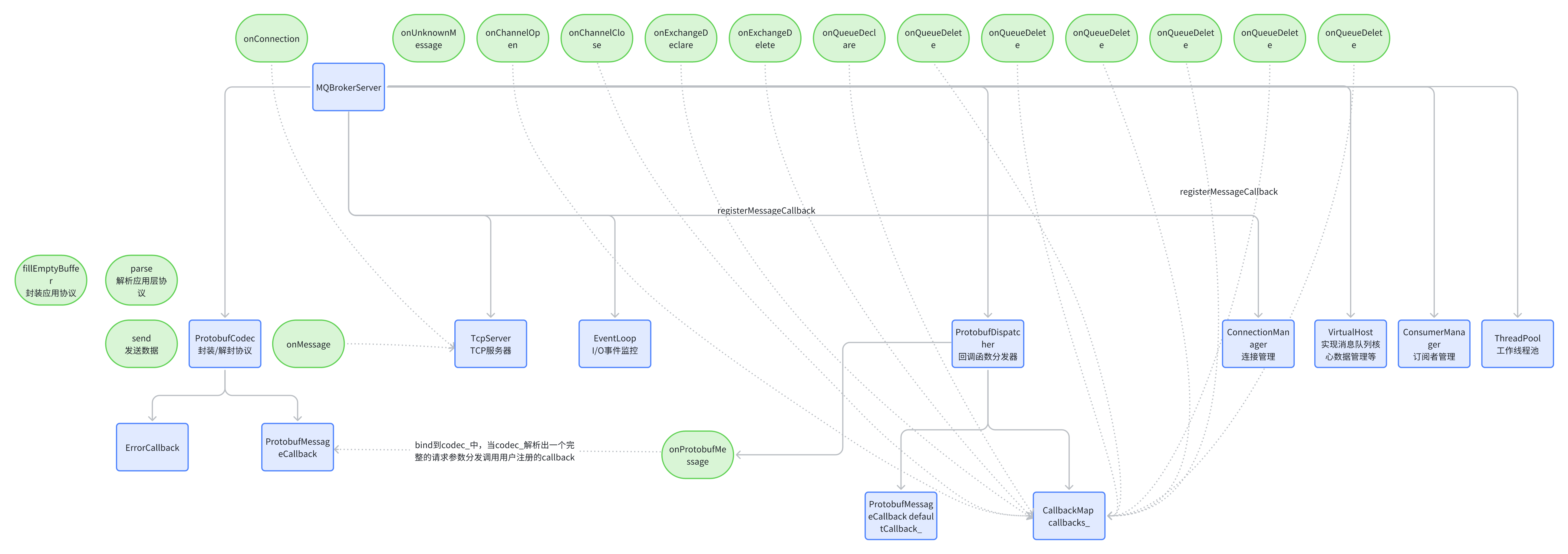 其中生产者和消费者都是客户端, 它们都需要通过网络和 Broker Server 进行通信。具体通信的过程我们使用 Muduo 库来实现, 使用 TCP 作为通信的底层协议, 同时在这个基础上自定义应用层协议, 完成客户端对服务器功能的远端调用。 我们要实现的远端调用接口包括: