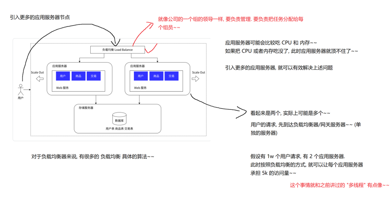 需引入负载均衡机制,将请求分发到多个应用服务器节点。