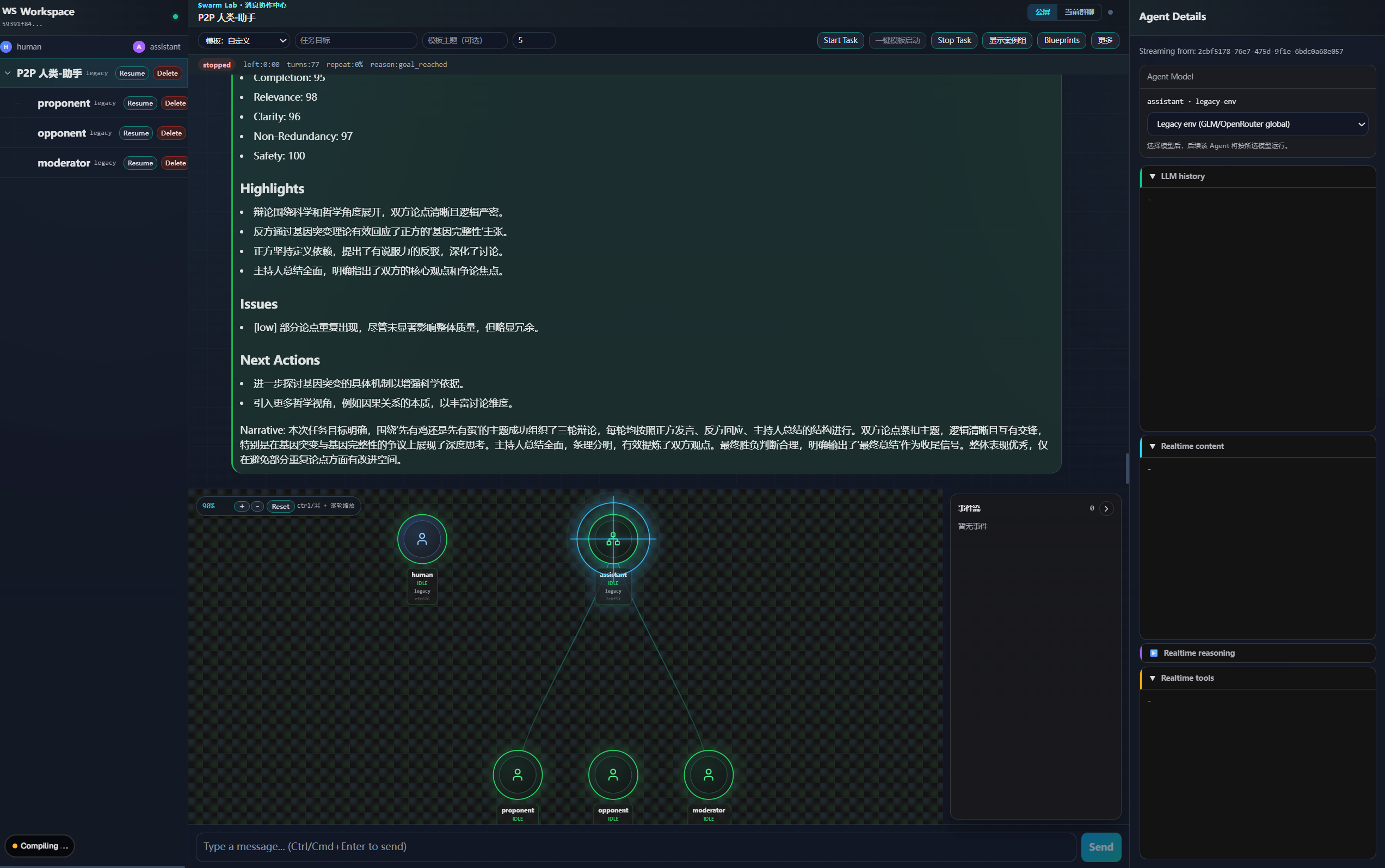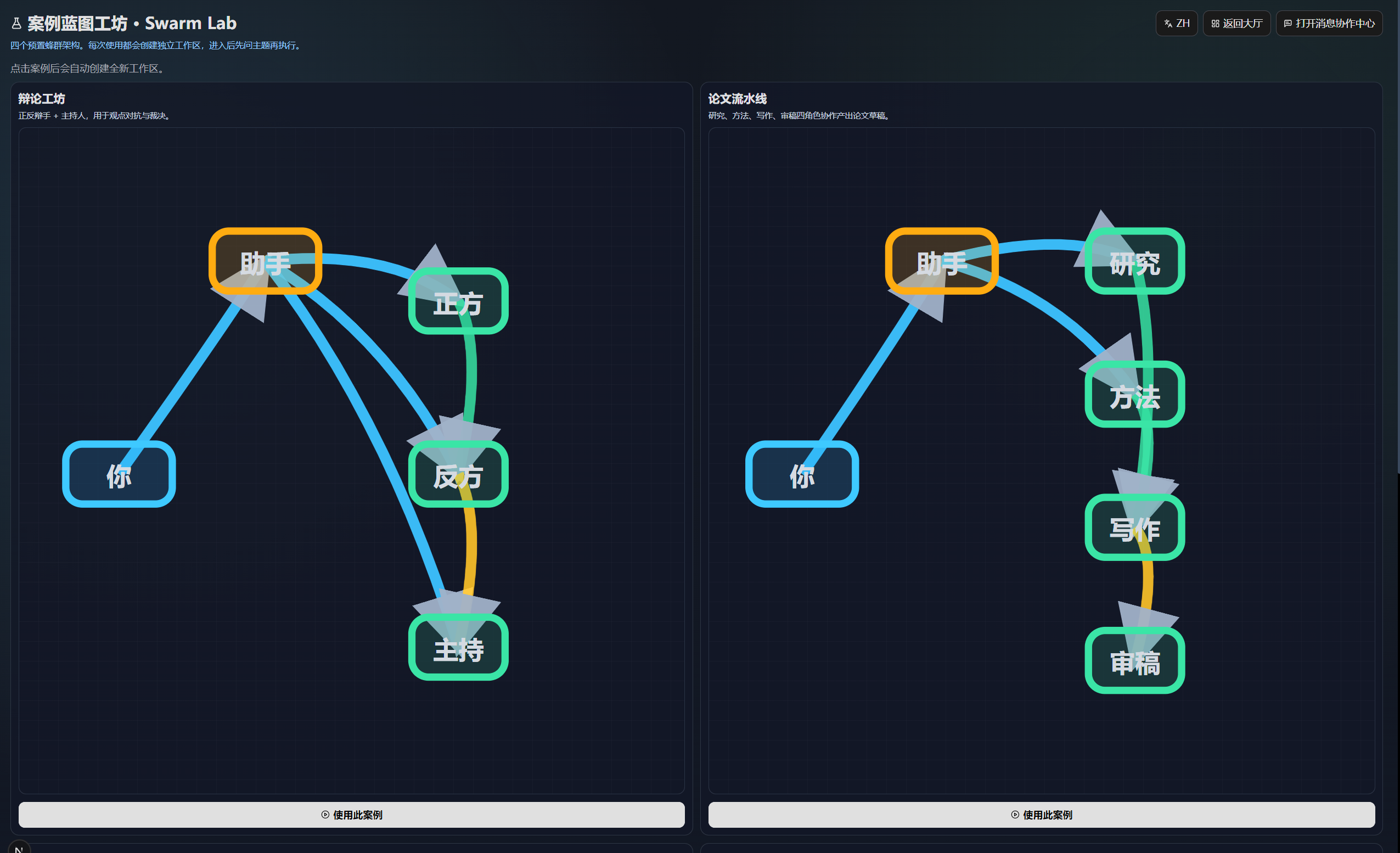 Swarm Lab 是一个全栈多智能体实验平台,基于 Next.js 构建,前后端一体,不需要单独部署 Python 服务。