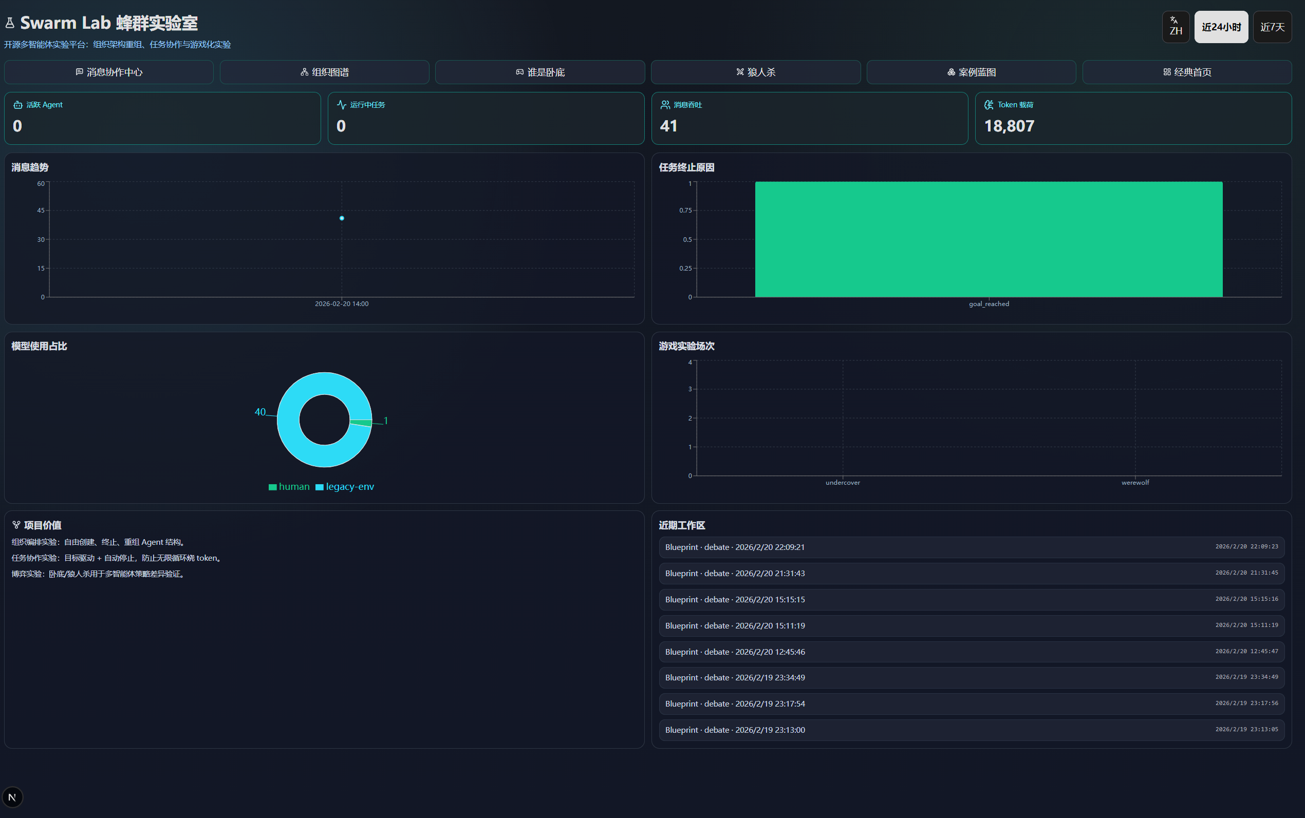 多 Agent 系统最有趣的地方不在于单个 Agent 有多强,而在于多个普通 Agent 组合在一起,能否涌现出超越个体的行为模式。这个问题目前还没有标准答案,Swarm Lab 就是为了帮你去探索这个答案而存在的。