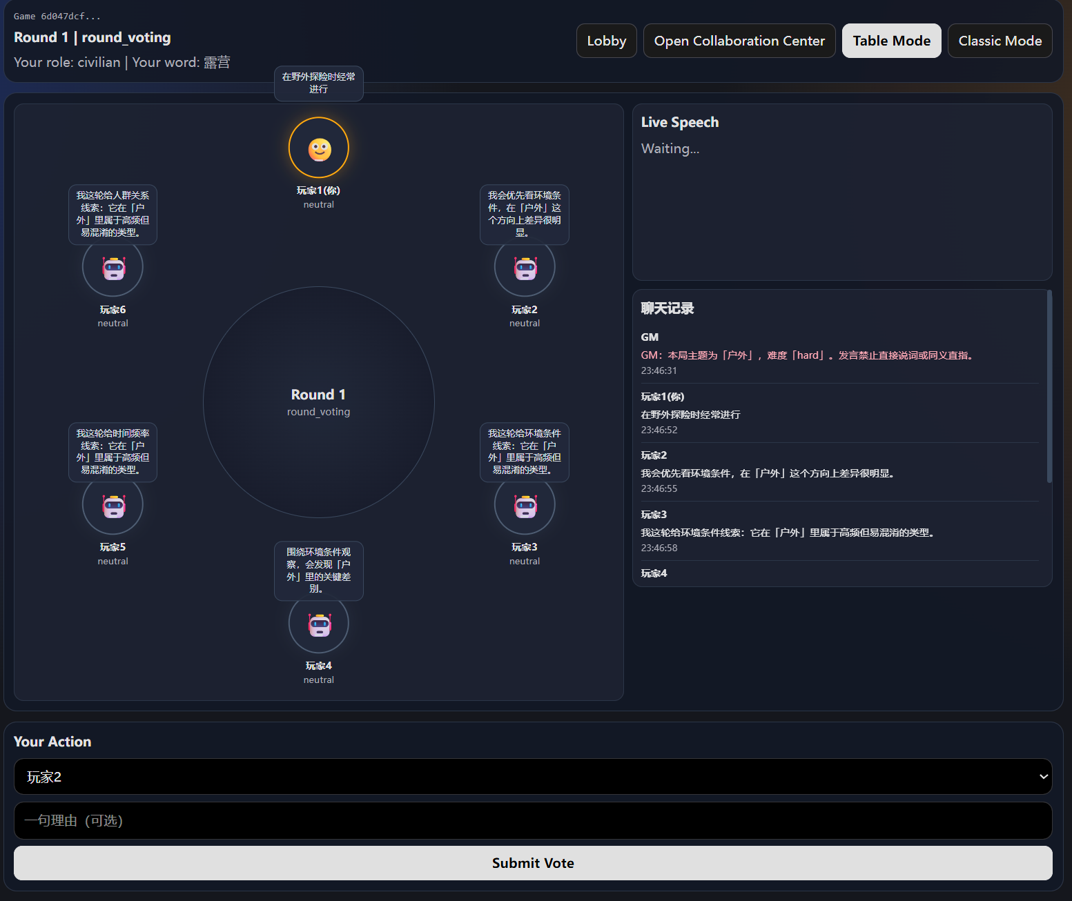 谁是卧底:1 个人类玩家 + 5 个 AI Agent,每局随机选出一个 AI 作为卧底,拿到不同的词。所有人轮流发言描述自己的词,然后投票淘汰。你能观察到 AI 是怎么根据别人的发言调整自己的描述策略的------哪些 AI 比较激进,哪些比较保守,哪些善于伪装。