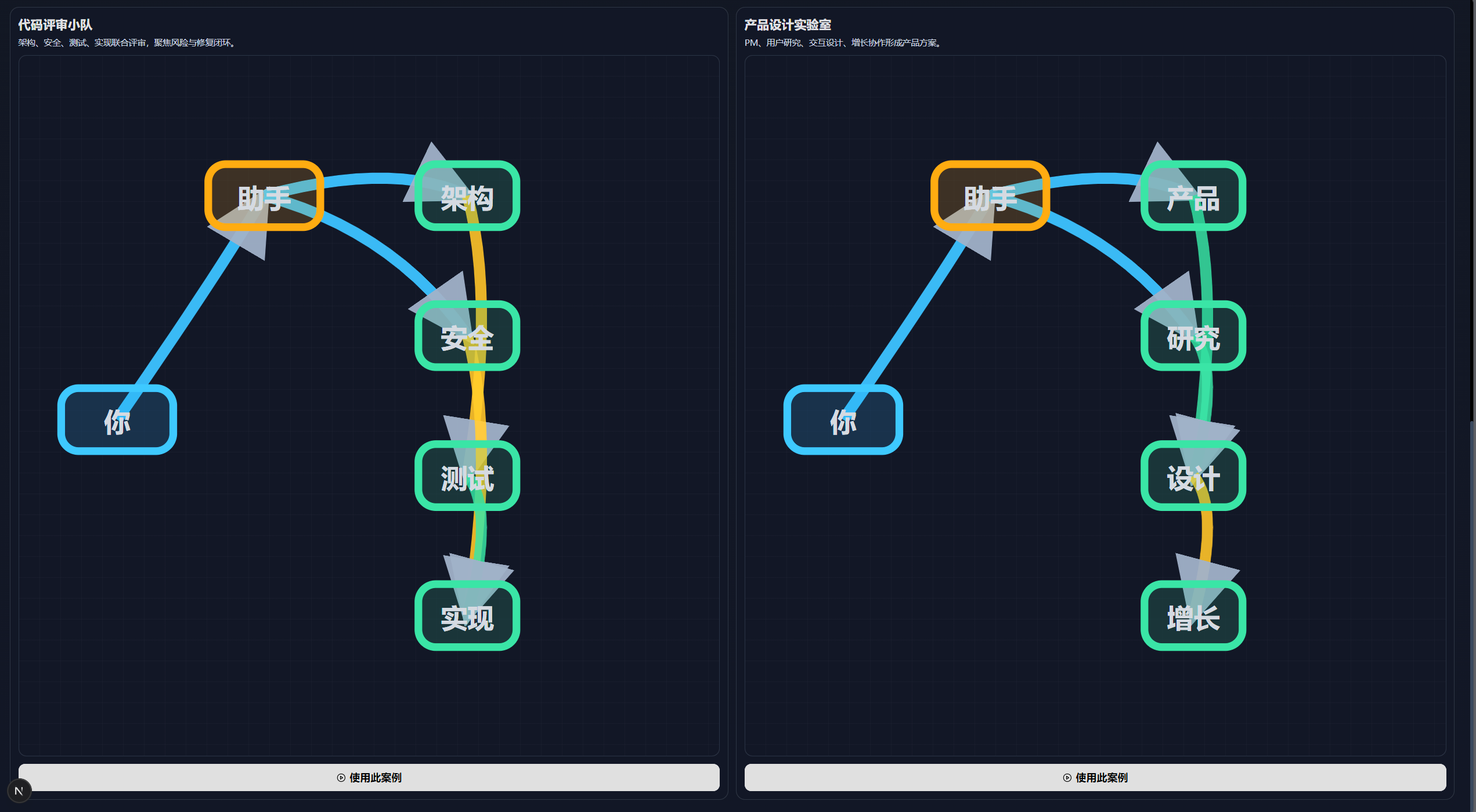 独立页面展示当前工作区所有 Agent 的父子层级关系。节点按角色类型有不同颜色,边表示派生关系。当 Agent 动态创建子 Agent 时,图谱实时更新。