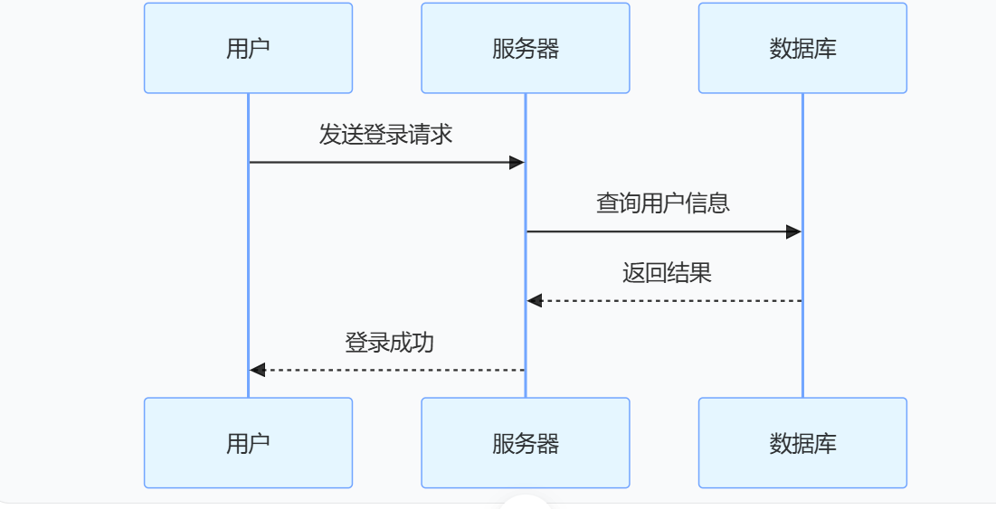 用途:描述角色 / 系统的交互顺序(如用户登录、接口调用)。示例代码: