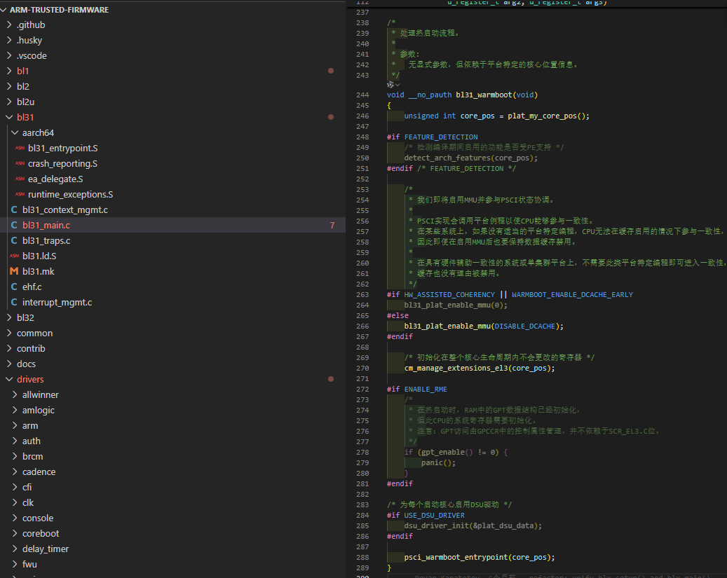 bl31_main()cvoid bl31_main(void) { // 1. EL3 基础初始化 bl31_early_platform_setup2(); bl31_plat_arch_setup(); // 2. 初始化运行时服务(包括 PSCI) runtime_svc_init(); // 3. 准备下一个镜像(BL32 或 BL33) entry_point_info_t *next_image = bl31_plat_get_next_image_ep_info(SECURE); if (!next_image) { next_image = bl31_plat_get_next_image_ep_info(NON_SECURE); } // 4. 跳转到下一个镜像 el3_exit(next_image); }