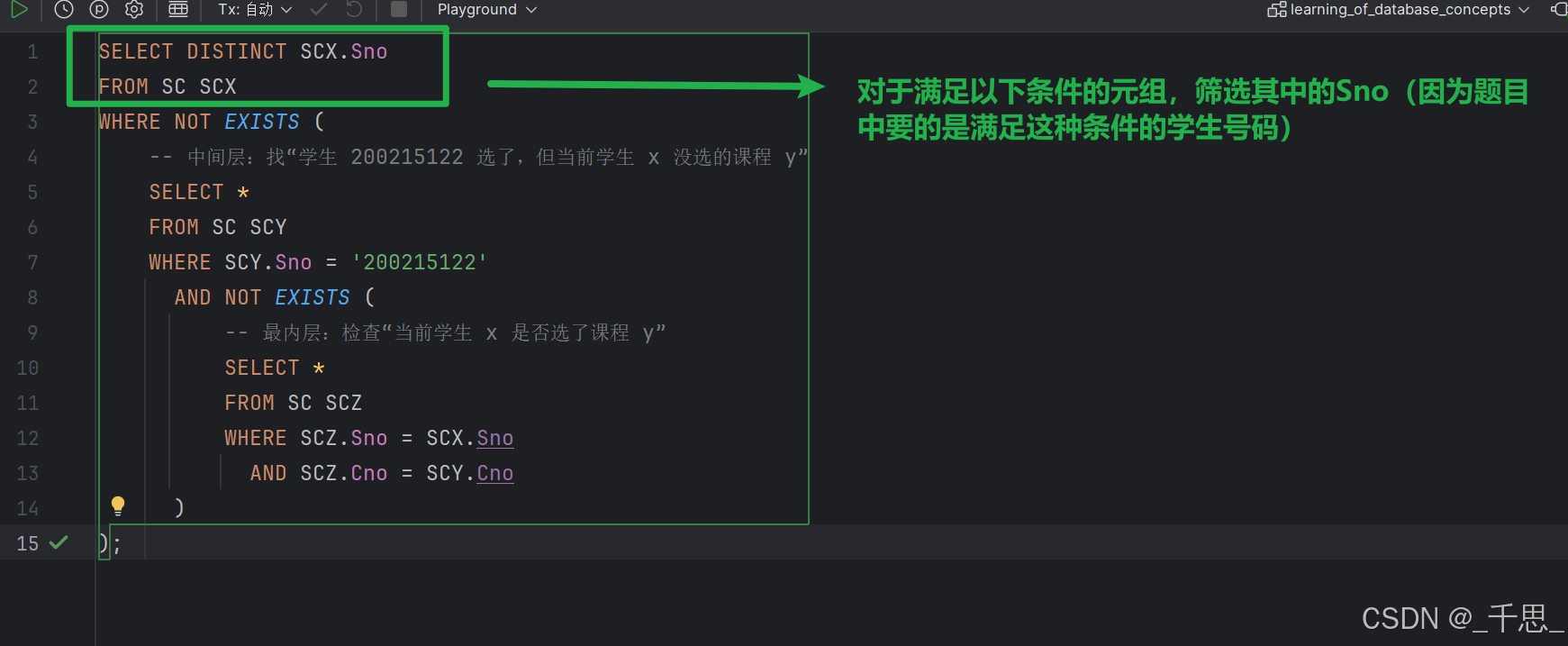 查询至少选修了学生200215122选修的全部课程的学生学号