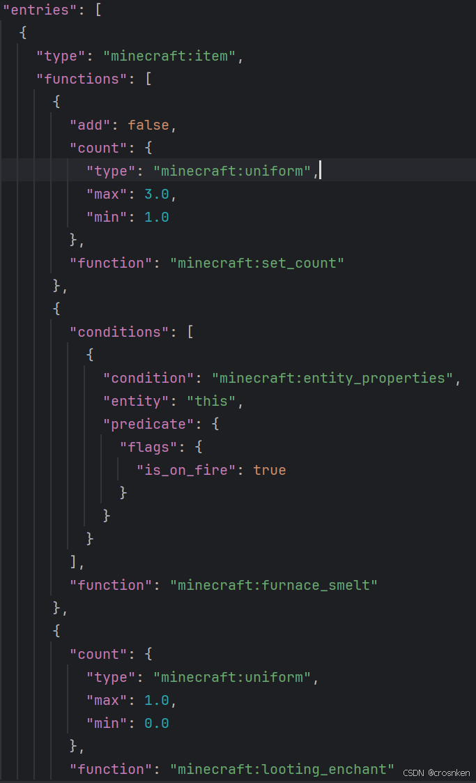 然后是在该实体属性满足is_on_fire的情况下,对掉落物进行furnace_smelt函数(也就是用熔炉煮熟牛肉)
