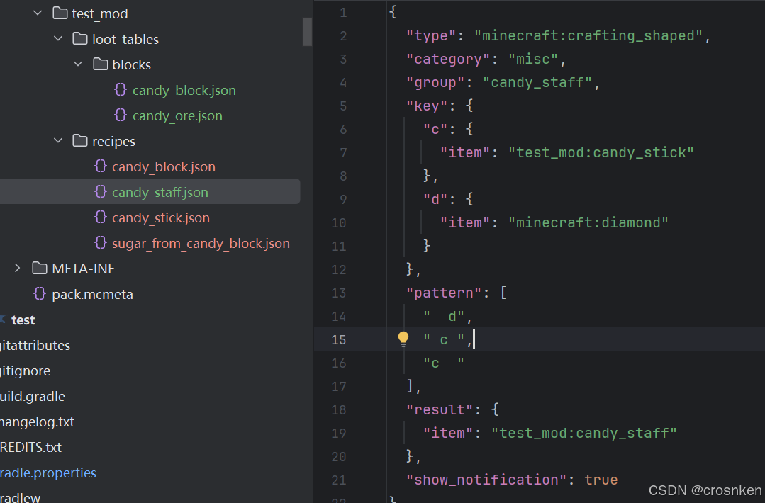 对于方块挖掘掉落物:(以测试模组中的candy_ore为例)