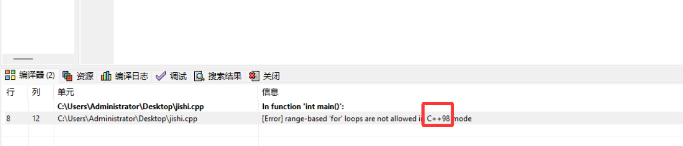 你的编译器默认使用 C++98 标准编译代码,但范围 for 循环(for (auto x : 容器))是 C++11 及以上标准才支持的特性,所以会报错。