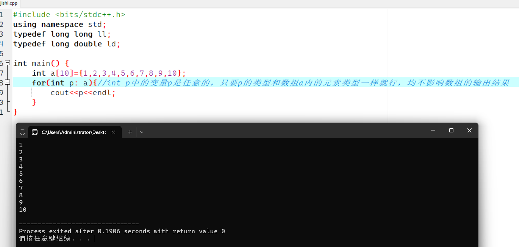 for(auto p: a){//int p中的变量p是任意的,只要p的类型和数组a内的元素类型一样就行,均不影响数组的输出结果