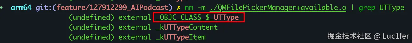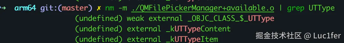 进入对应的编译产物目录,找到对应的.o文件,通过nm命令查看对应的符号,发现对于UTType的依赖是强依赖,并不是weak。