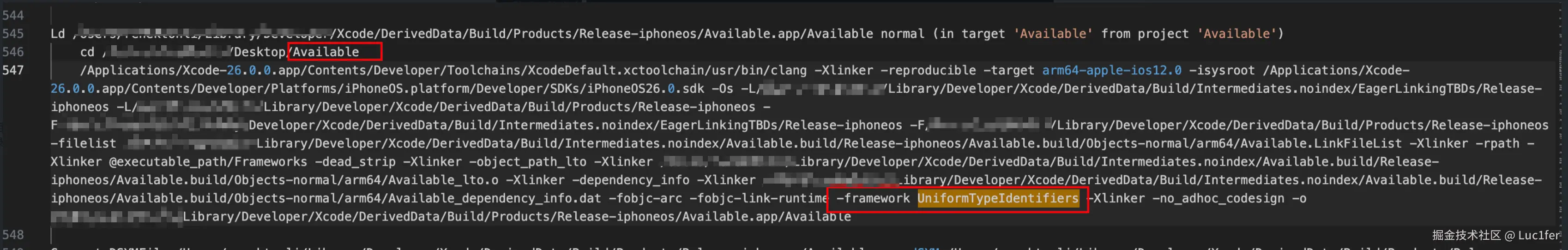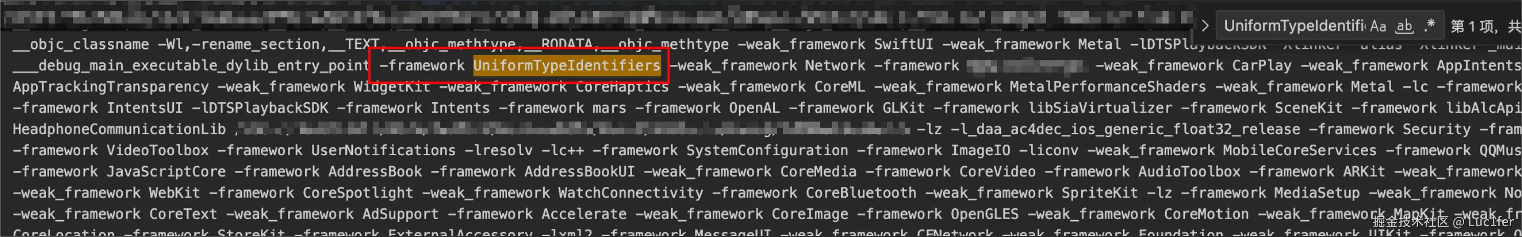 既然是编译后出现问题,那么想当然是编译的参数设置有问题。查看了build setting,build phases发现都没有设置UniformTypeIdentifiers的依赖。打开编译log搜索UniformTypeIdentifiers关键字,发现使用的是-framework进行的链接。