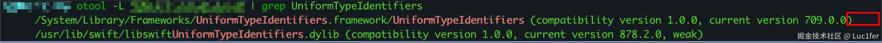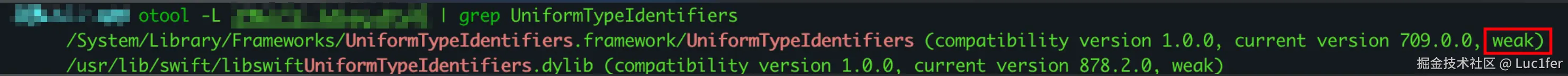所以是在编译的时候系统分析符号依赖时,如果先导入UTI,他会认为此时符号是strong的,然后我们编译完成真正的用到了UTI的符号,此时就会变成强依赖符号。最后生成的产物就会强依赖UniformTypeIdentifiers库。