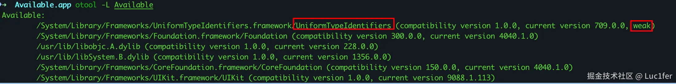 那么为什么我的代码会新增对系统库UniformTypeIdentifiers的依赖呢?对比了两次提交的构建产物发现,我的代码提交之前对UniformTypeIdentifiers的依赖是weak,提交之后就不是了。