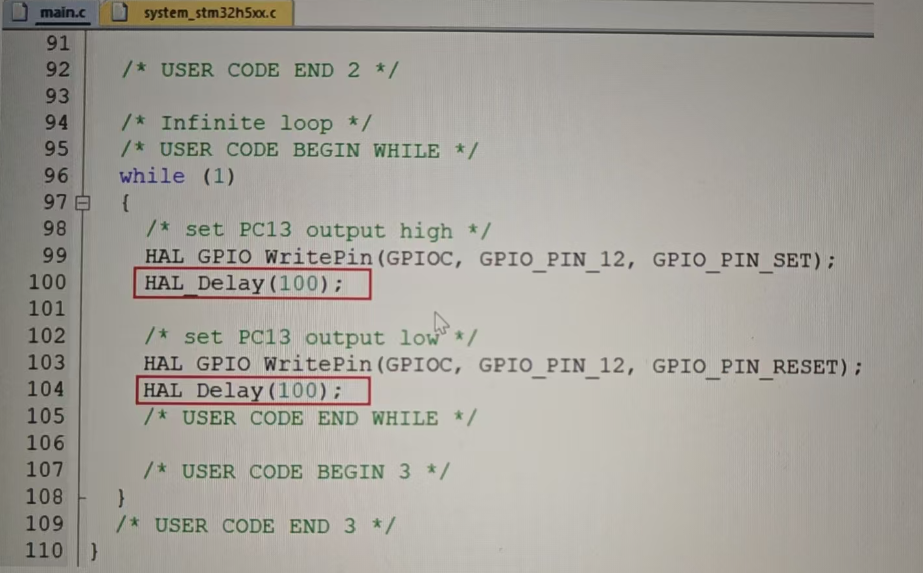 图中是 main.c 的 while 循环,LED 先灭(GPIO_PIN_SET)延时 100ms,再亮(GPIO_PIN_RESET)延时 100ms。要想让 LED 闪烁更快,可以把 HAL_Delay(100) 改成更小的值,比如 50 或 20。修改后重新编译生成新的 h5_app.bin。