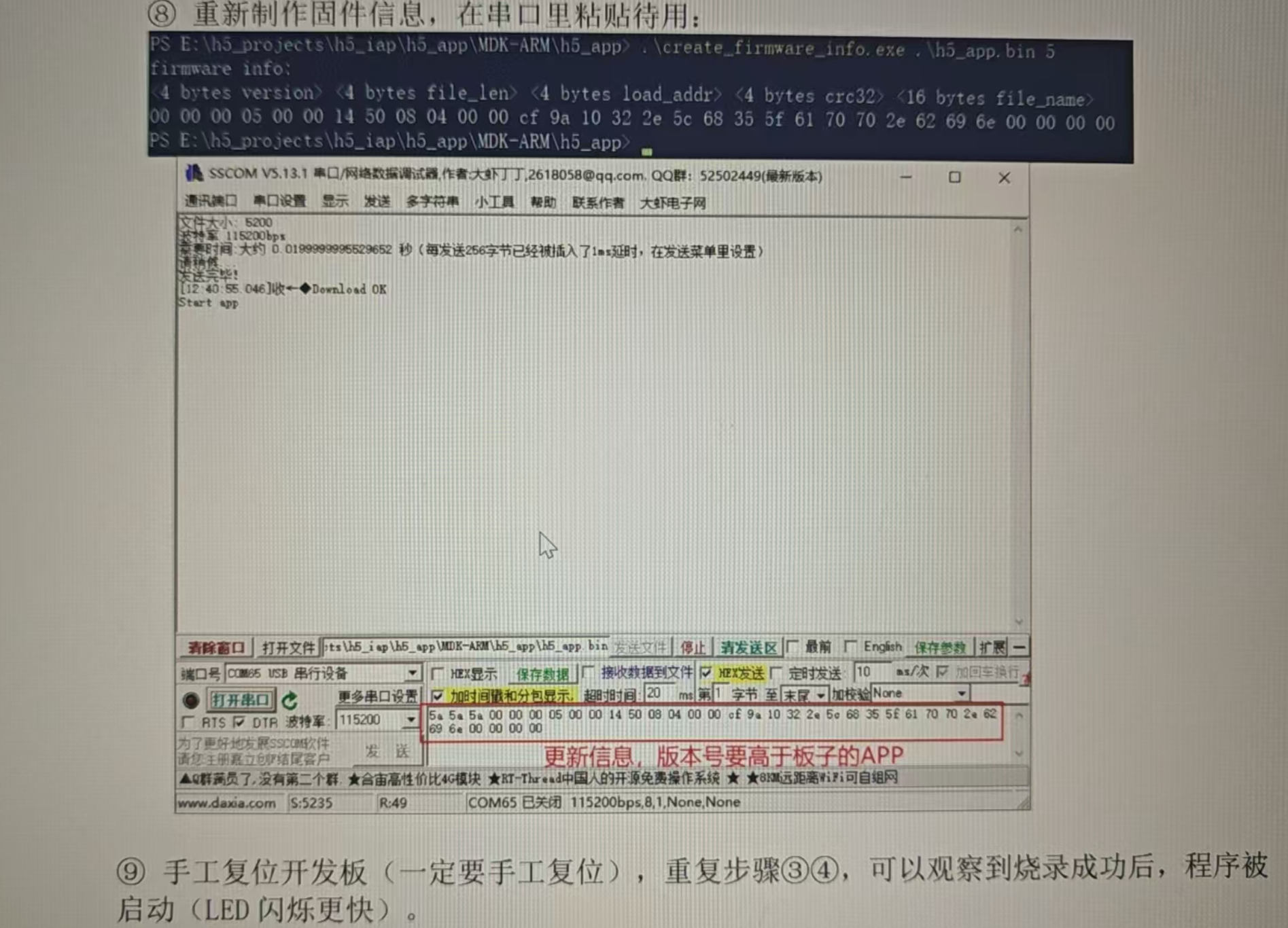 右侧串口工具界面:提示我们手工复位开发板,重复之前的发送步骤(先发同步头