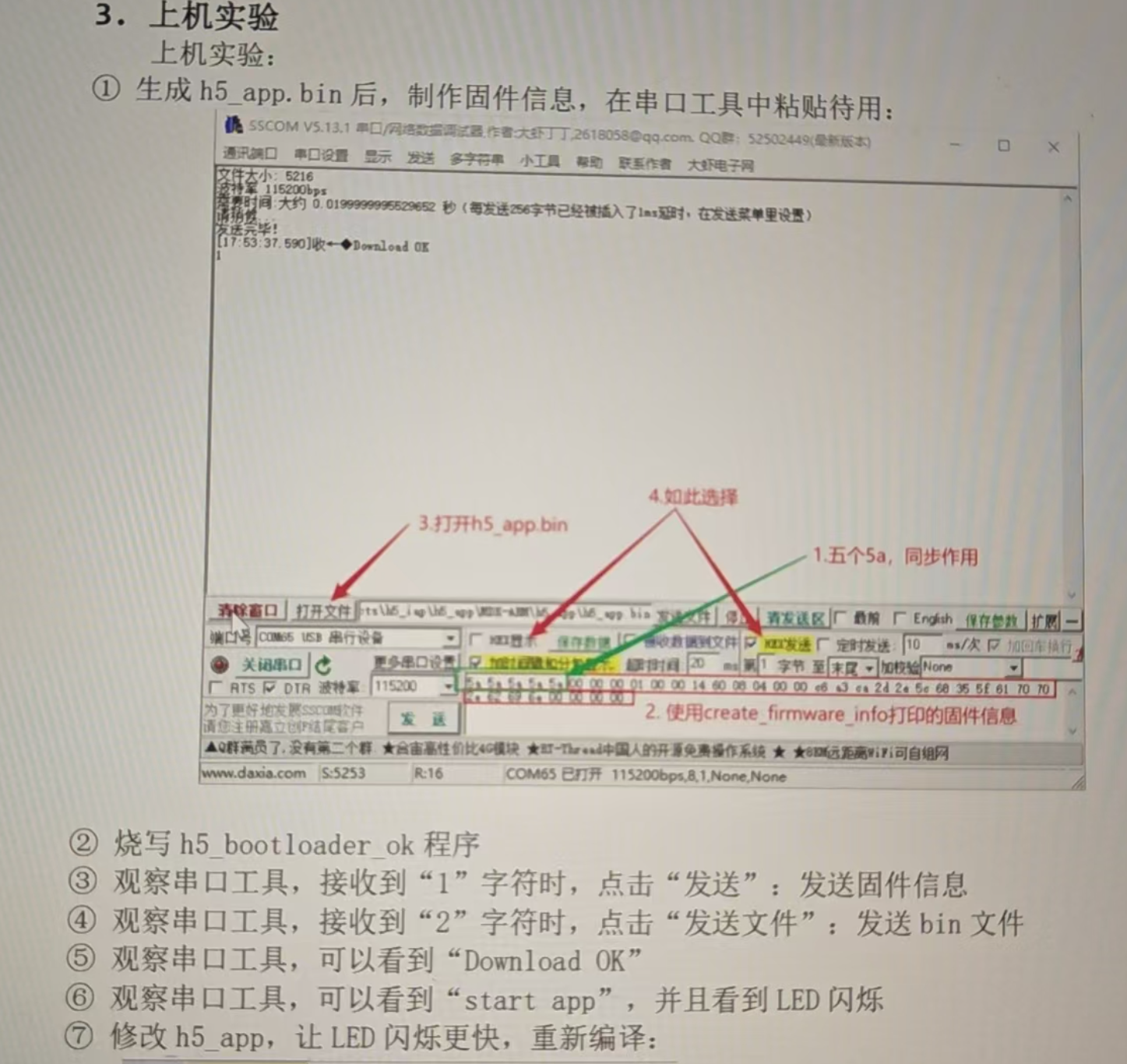 5A...,再发新固件信息,最后发新的 bin 文件)。烧录成功后,程序自动启动,LED 闪烁速度会变快(因为延时改小了)。