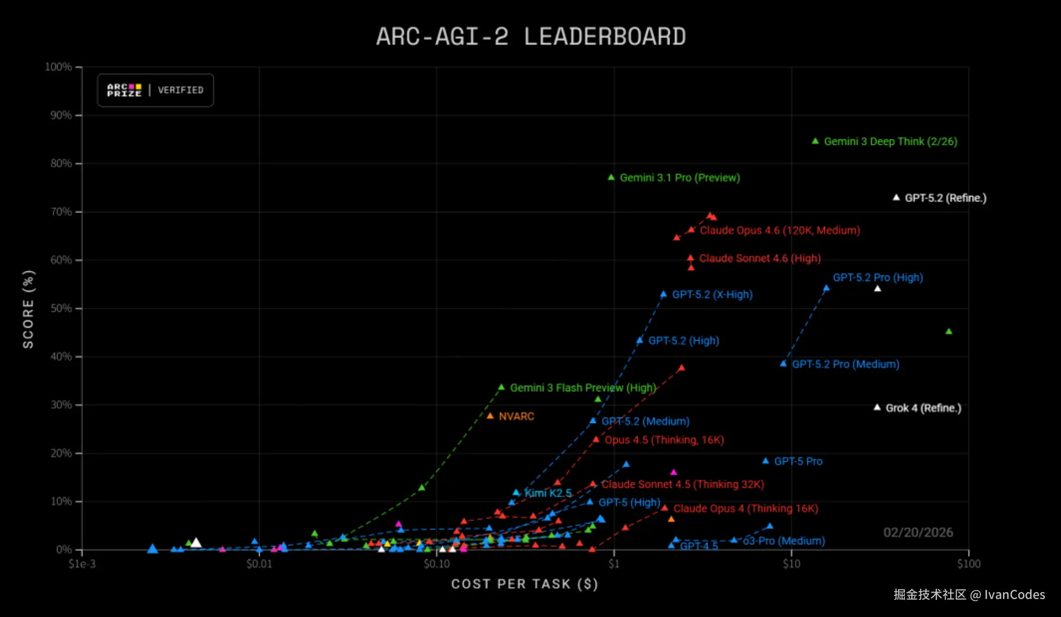 在 ARC-AGI-2 Leaderboard 散点图中,Gemini 3.1 Pro 处于高分 + 低单次成本的区域。