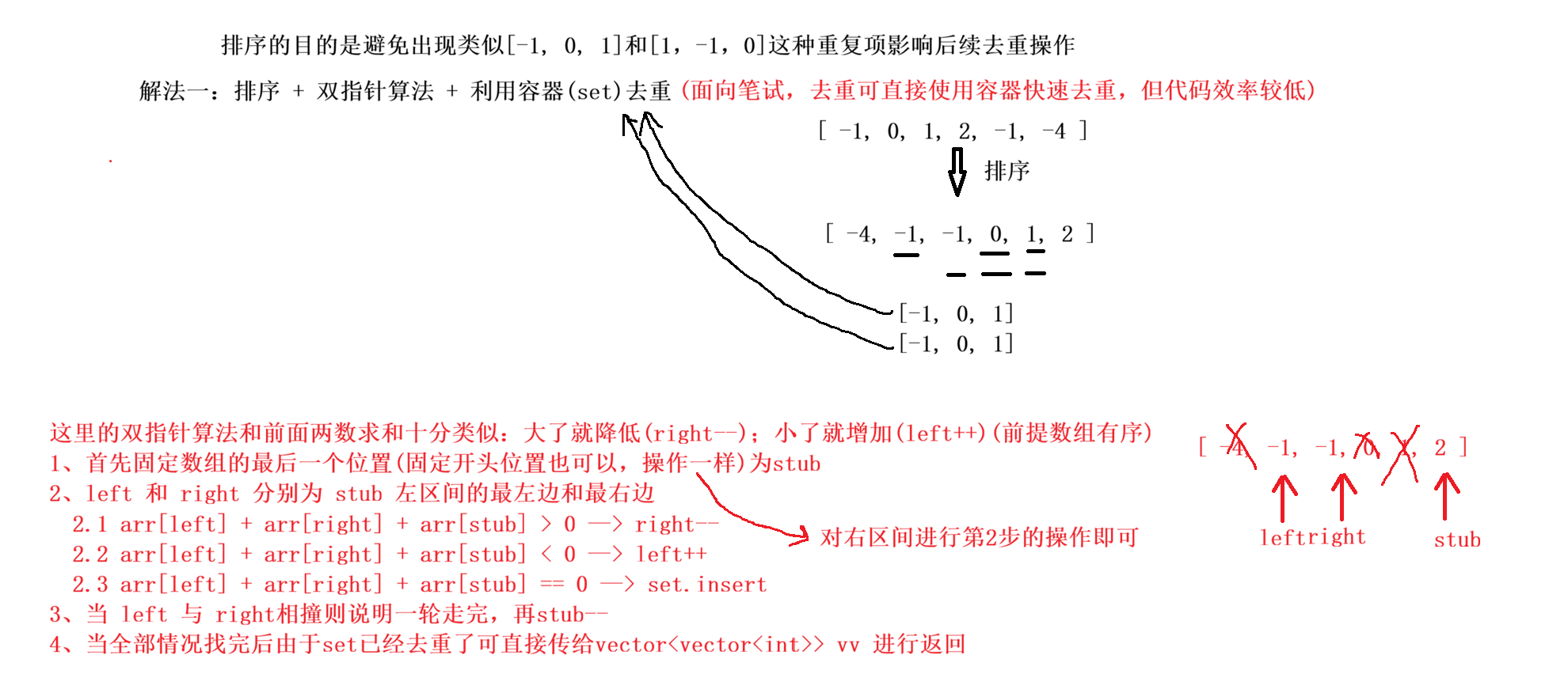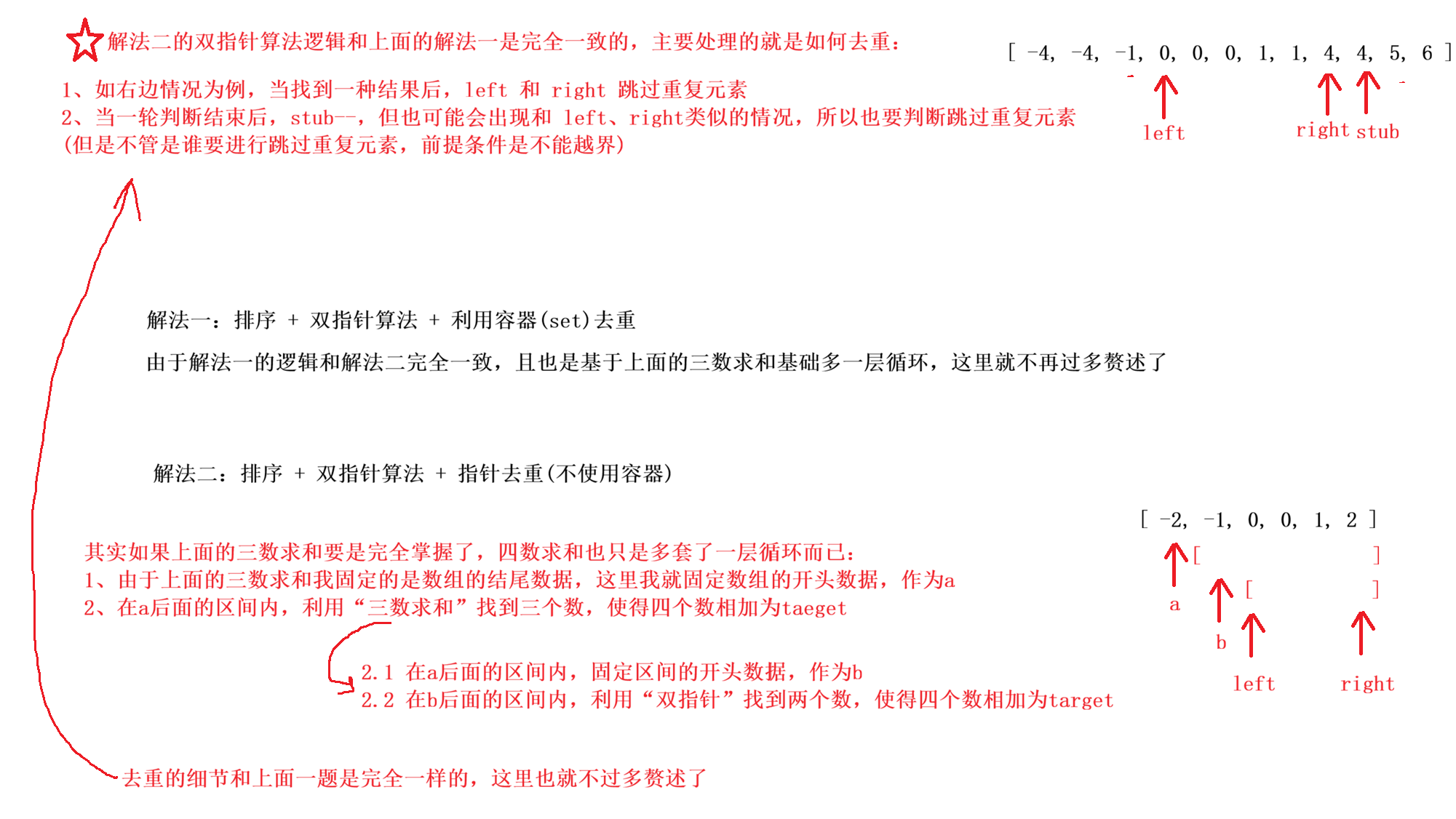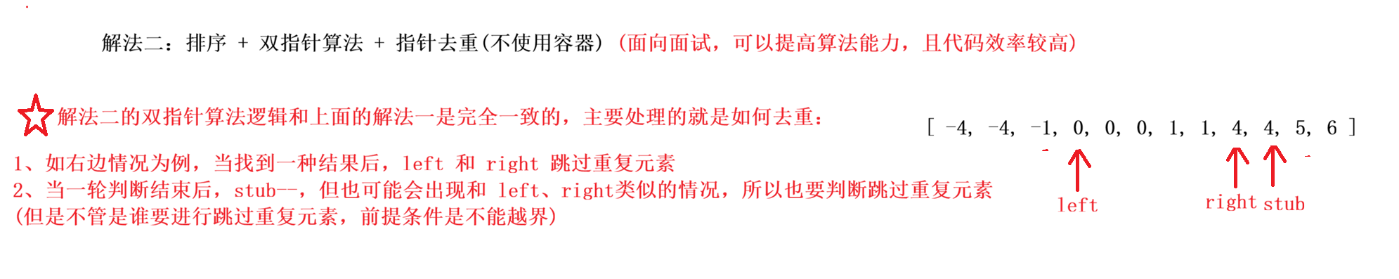 - 在这个数后面的区间内,使用**【双指针算法】** 快速找到两个数之和等于 -stub 即可。