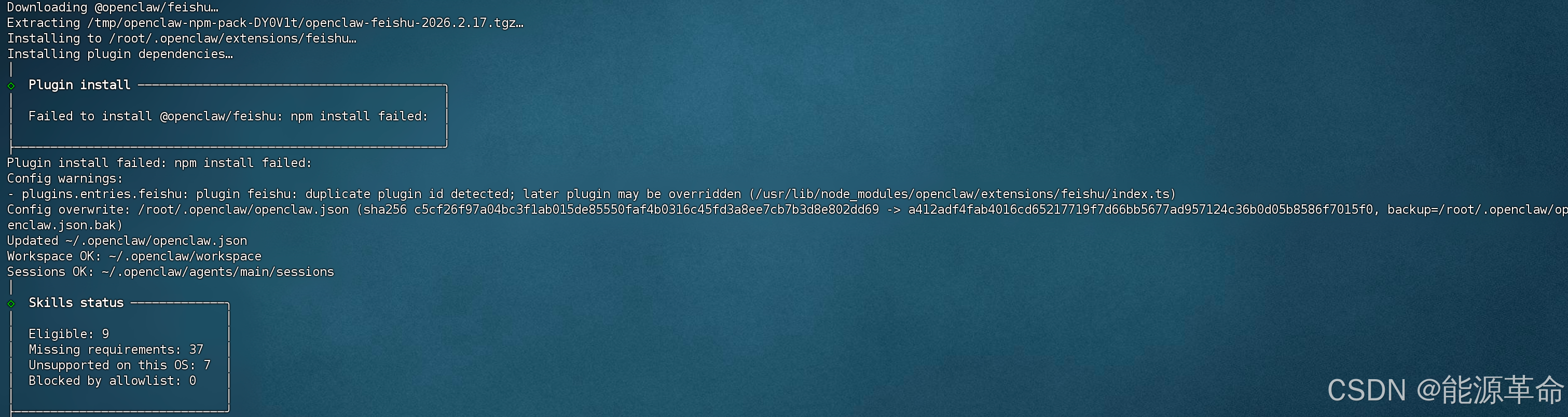 飞书的插件是要进行安装的,现在openclaw的配置界面里面也支持了飞书,我通过openclaw的配置安装了几次,并没有成功,提示缺少包或插件重复