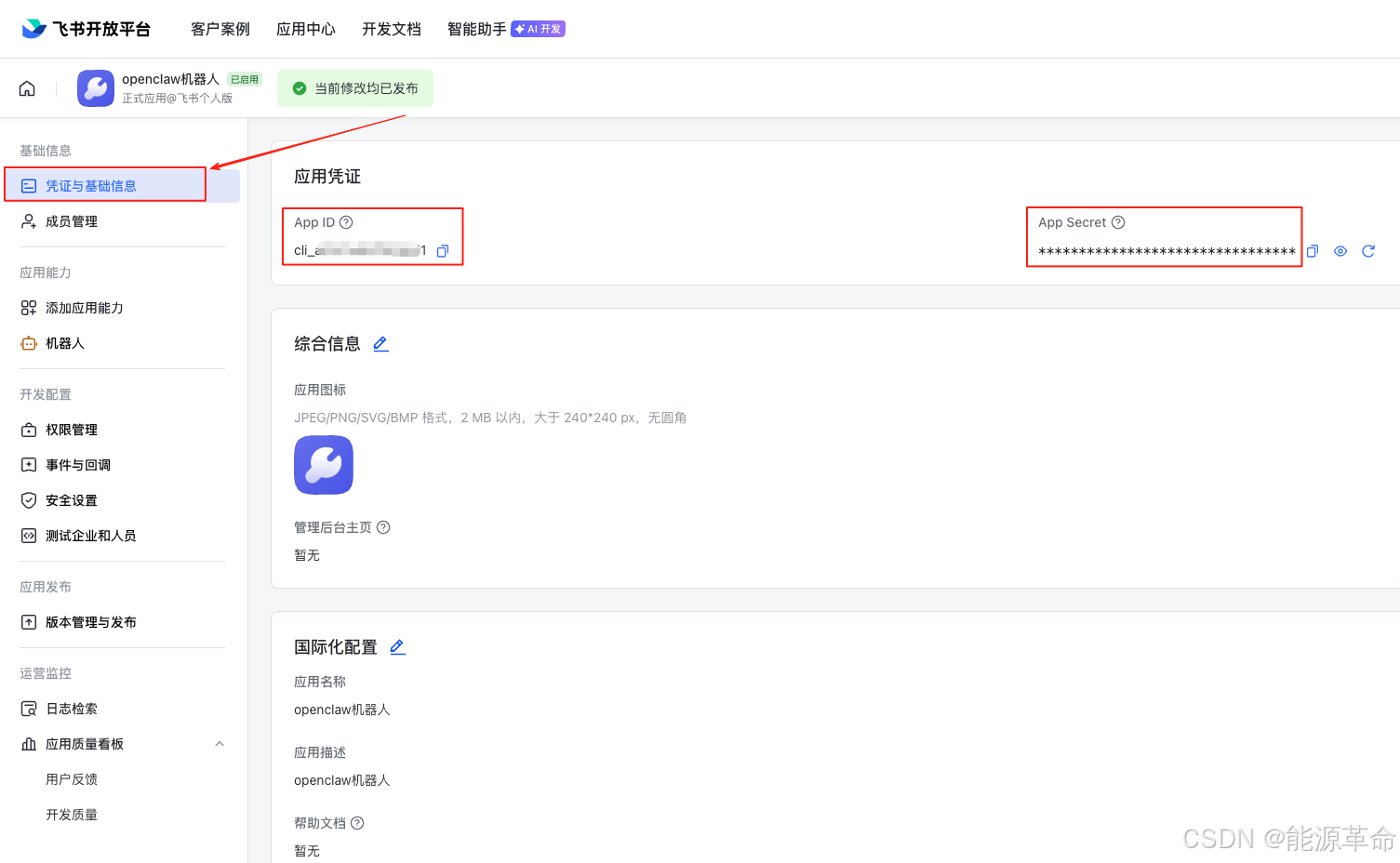 创建成功后,在"凭证与基础信息"中找到 App ID 和 App Secret,把这2个信息复制记录下来,后面需要配置到openclaw中