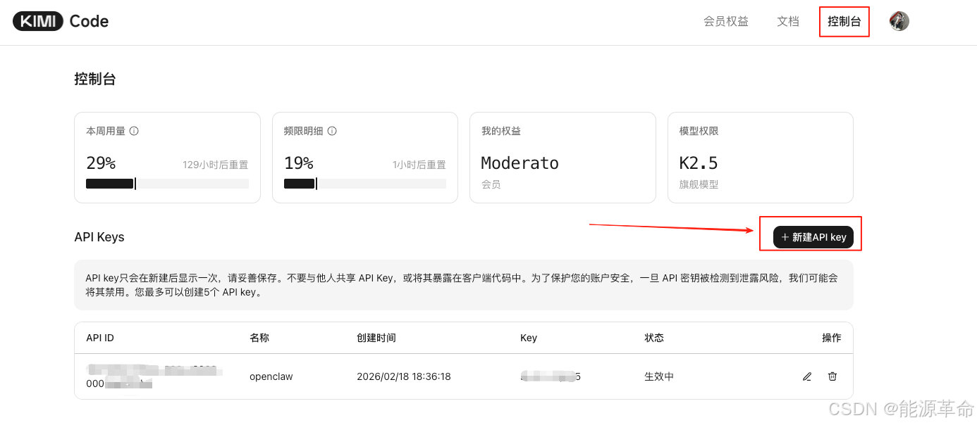 这个API key一定要复制下来,因为你点完【完成】之后,你就再也无法查看你的API key了,如果你忘记了你的API key,那就只能重新创建一个了。复制完后,找地方先保存起来,后续在OpenClaw配置的时候会用到。