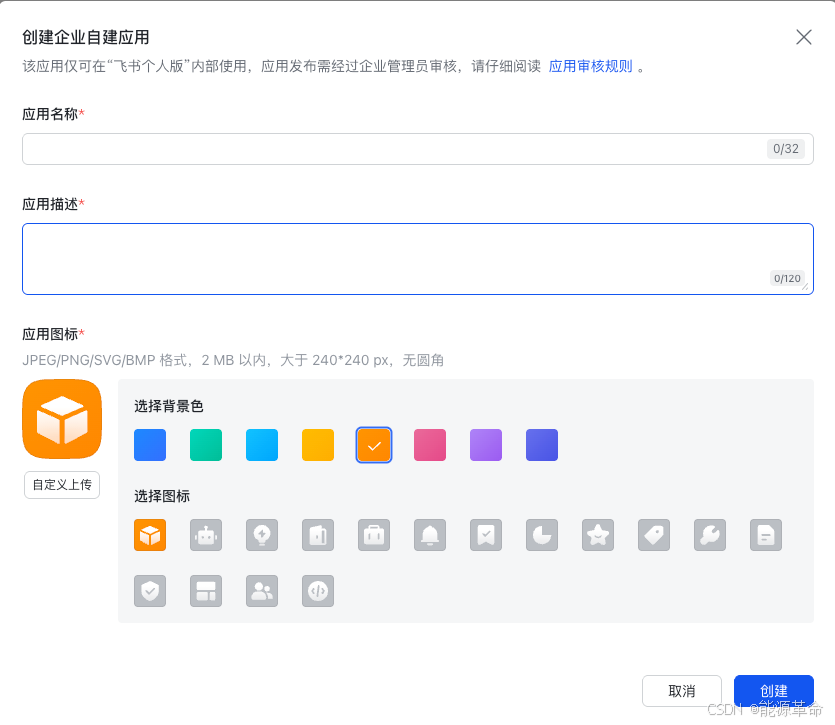 填写应用名称和描述后就直接创建:
