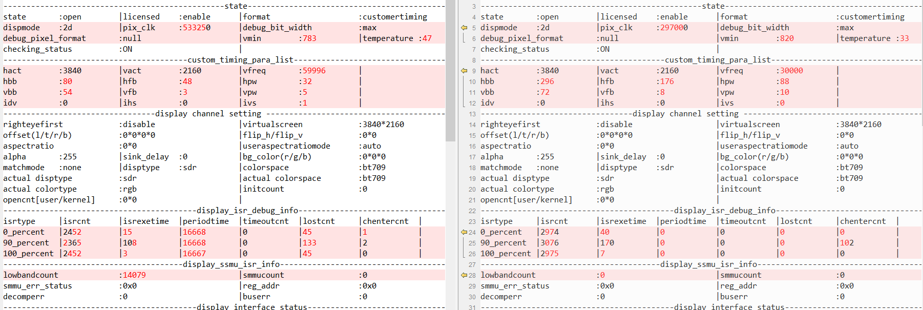 除了pix_clk及时序不同外,60HZ 有lowland count ,DISPLAY_BUS_UNDERFLOW_INT字面意思像是低带宽,而且已经为控制器的中断。 bus理解为HDMI控制器到显示器的接口。