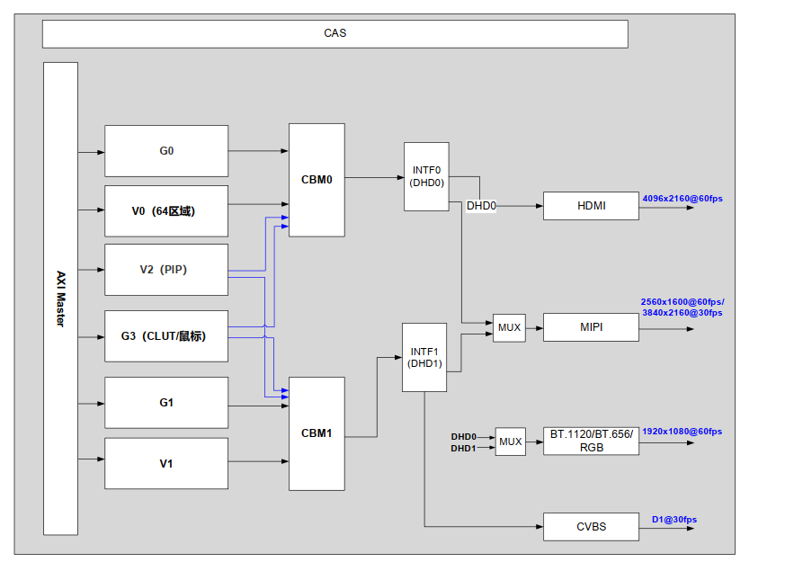 2160P@60fps 时序输出时, 存在性能限制:G0 层 ARGB8888 格式所支持的最大分辨率为 1080P。建议此时 G0 层采用 1080P 分辨率(格式不限)、同时开启图形层放大功能 , 将 G0 层在线放大到 2160P 进行显示; 或者采用 2160P 分辨率、 ARGB1555或 ARGB4444 格式