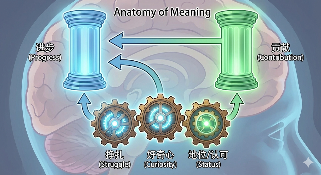 要在这个时代拒绝平庸,你必须理解驱动人类灵魂的"动力工程学"。意义并非虚无缥缈,它的顶层建筑由两个核心支柱支撑:进步 (Progress) ------感受到自己在克服阻力;以及 贡献 (Contribution) ------感受到这种进步对他人有价值。