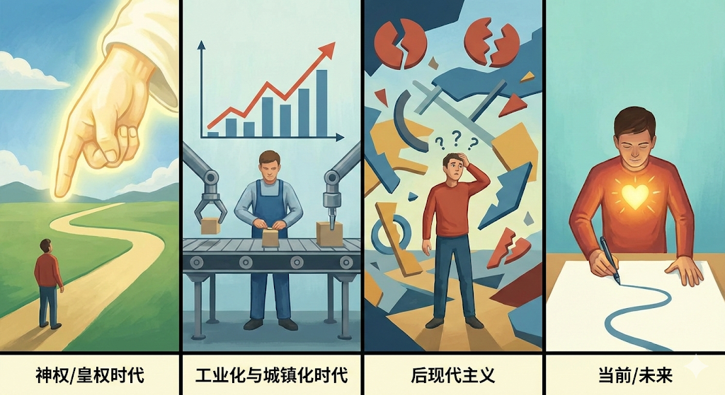 人类文明对"意义"的探寻经历了一场漫长且残酷的演变。理解这一路径,是每一位"意义建筑师"定位自身坐标的前提:
