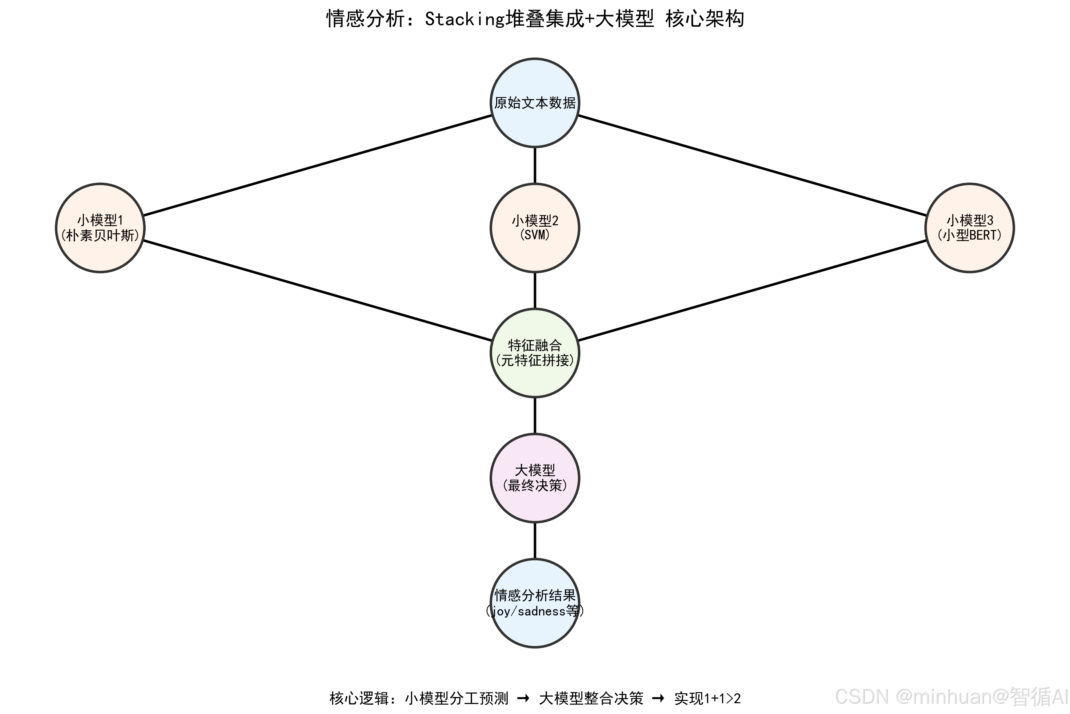 **核心目标:**单个小模型可能"看问题片面"(比如有的模型擅长识别正面情绪,有的擅长识别负面),但大模型整合所有小模型的结果后,能做出更全面、更准确的决策,实现"1+1>2"。