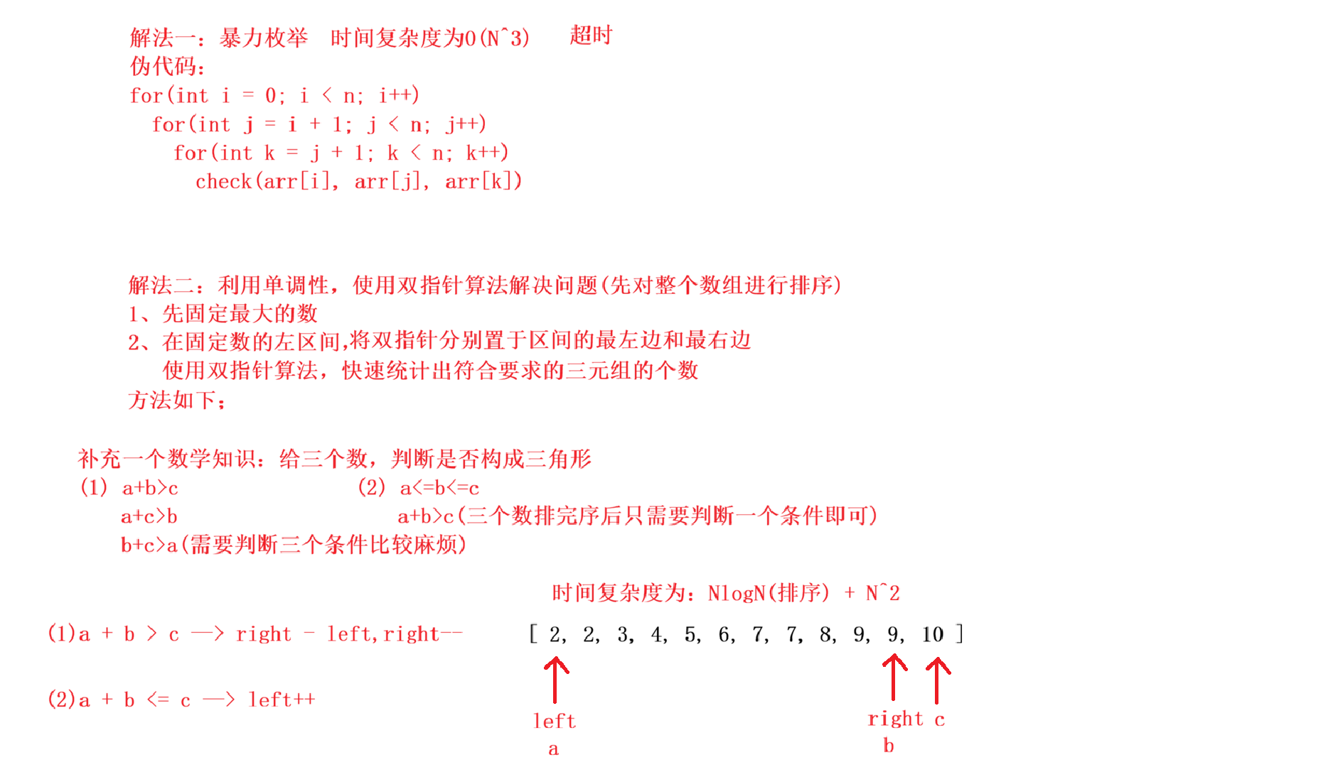 根据【上述优化思想】我们可以固定一个【最长边】 ,然后在比这条边小的有序数组中找出一个二元组,使得这个二元组之和大于这个最长边。由于数组是有序 的,我们可以利用【对撞指针】来优化。