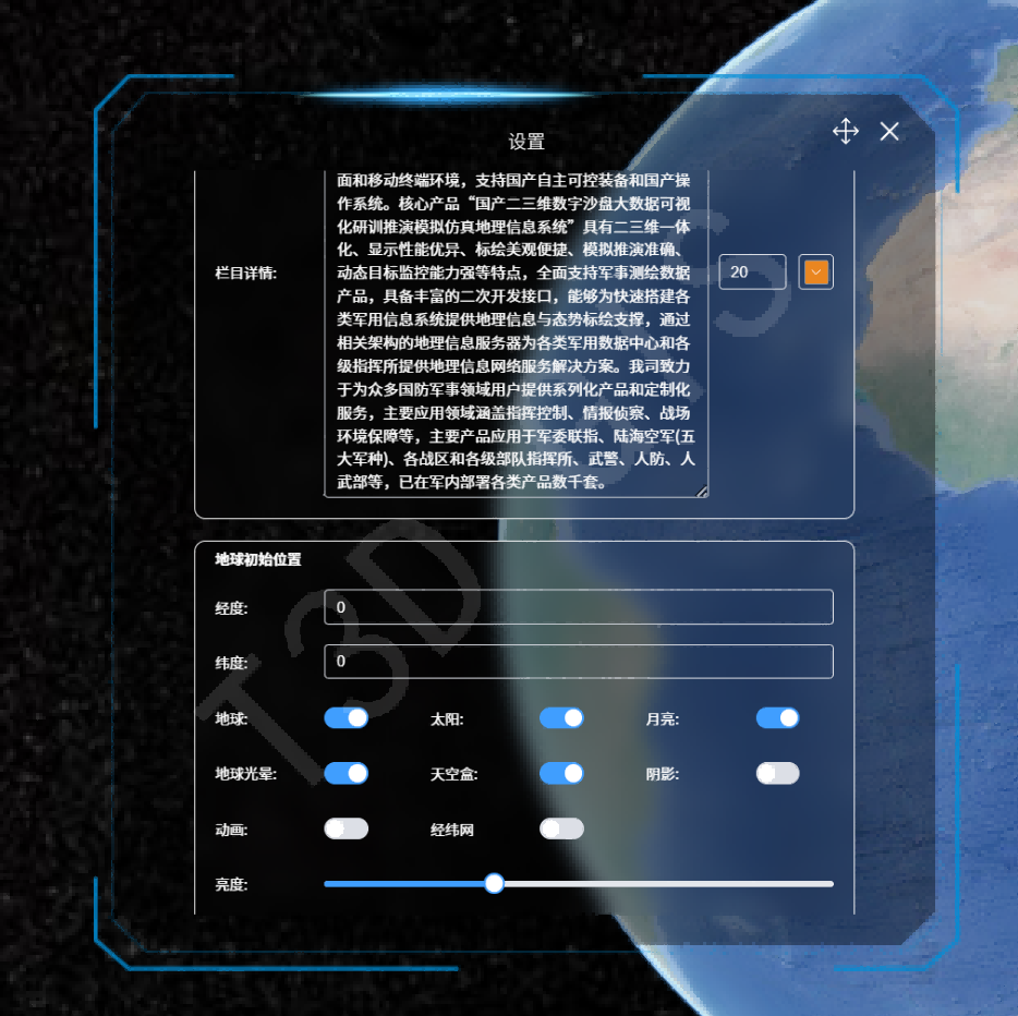 地球显隐:全局开关地球模型显示(适用于太空仿真场景)。