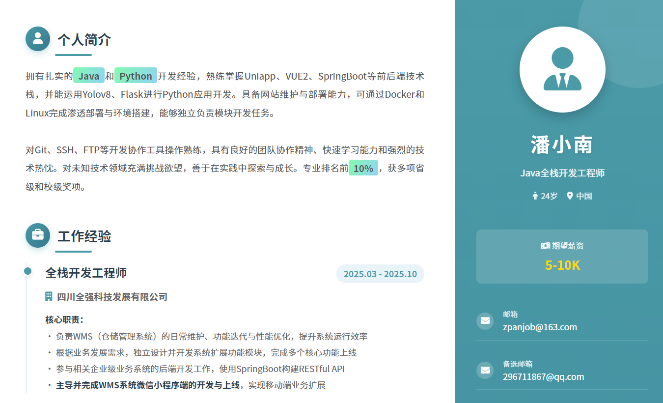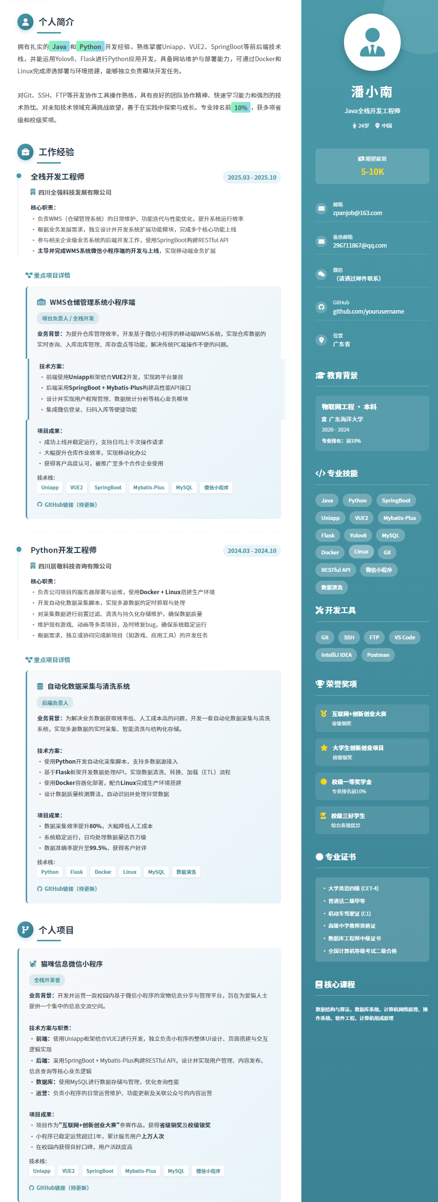 - 分类清晰:工作经验、个人项目、校园经历分开